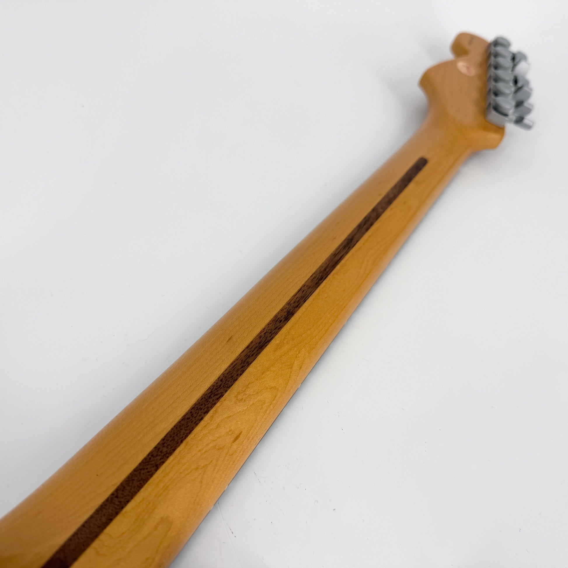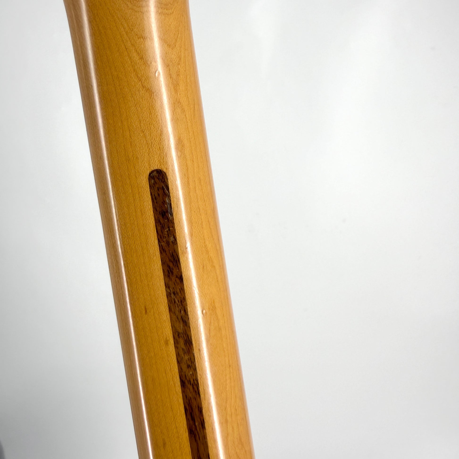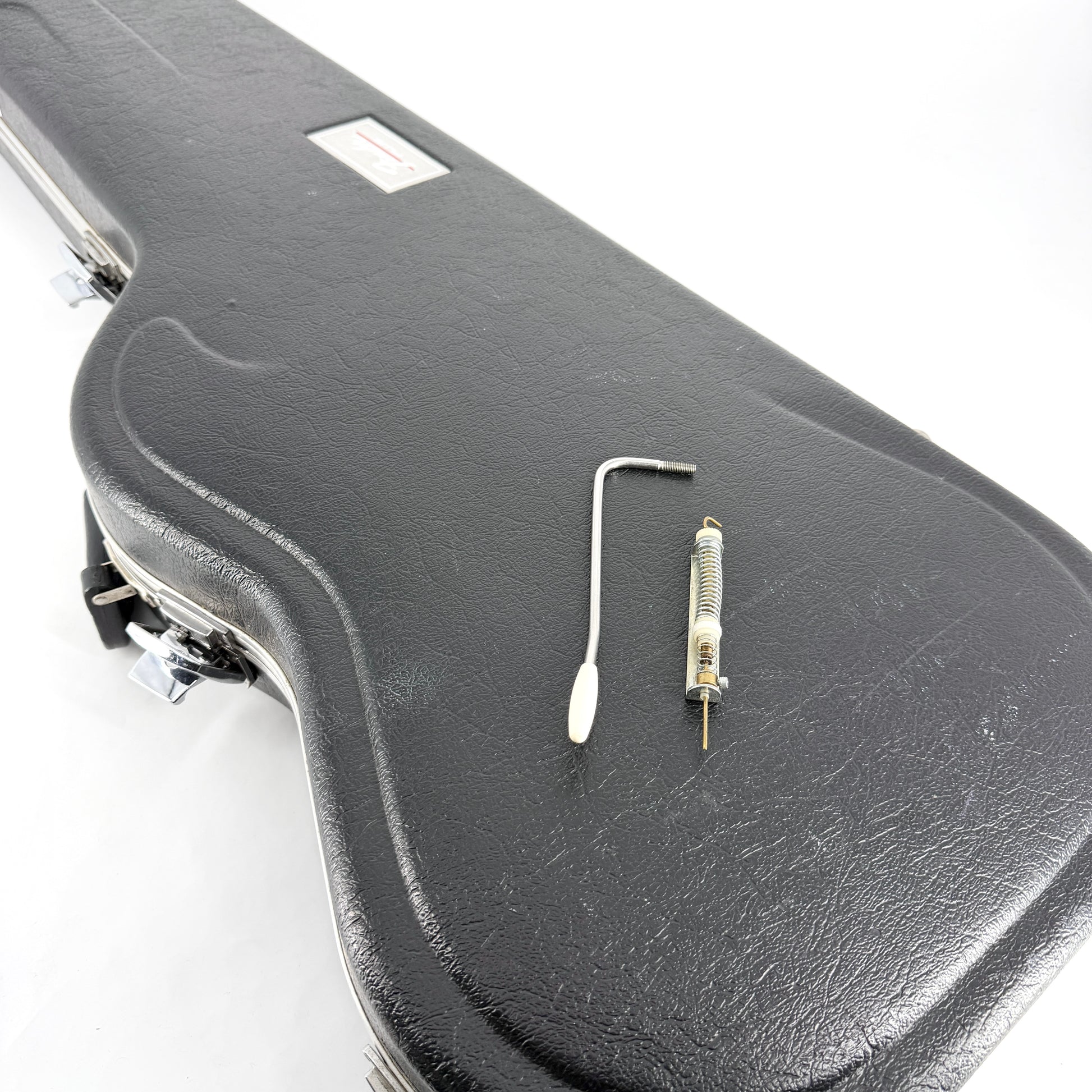 It has an Alder body, a comfortable modern-C (slim/medium) profile Maple neck with Rosewood fingerboard, Schaller locking tuners, roller nut, and 6-saddle trem bridge. The Hipshot tremsetter has been removed but is included in the case.