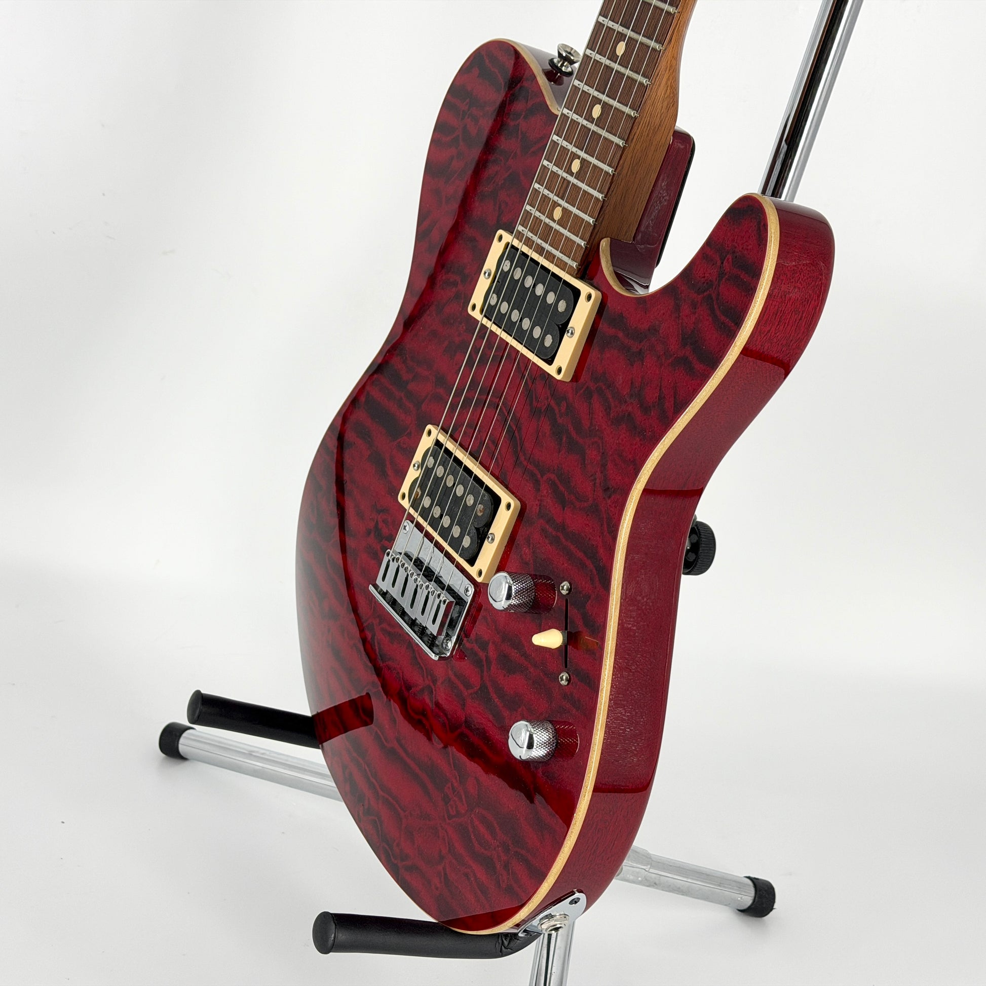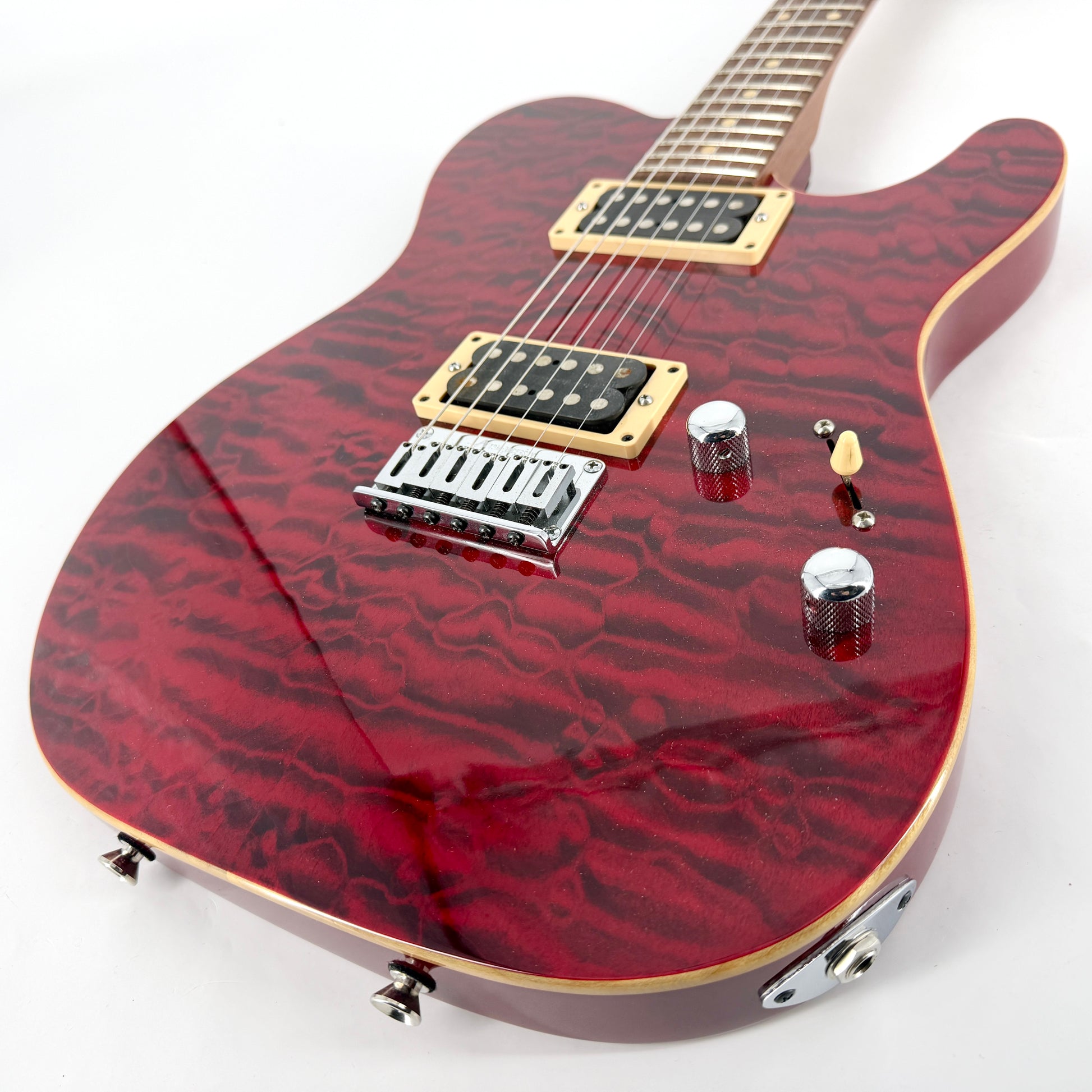 Premium USA 'Telecaster' style guitar and a great example of Tom Anderson Guitarworks’ exceptional craftsmanship. Finished in Cajun Red and with a truly stunning highly quilted top that we've photographed in both studio and natural light for comparison - the book-matching is first class on this one.