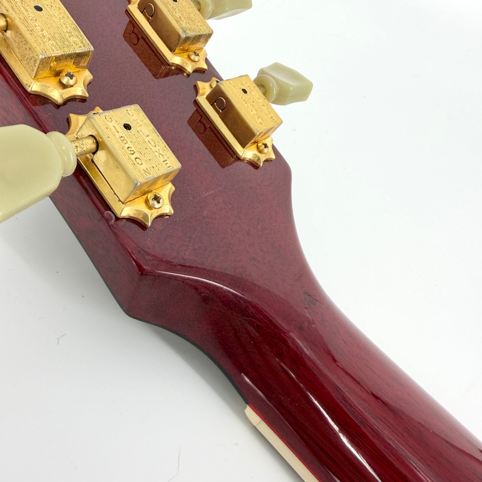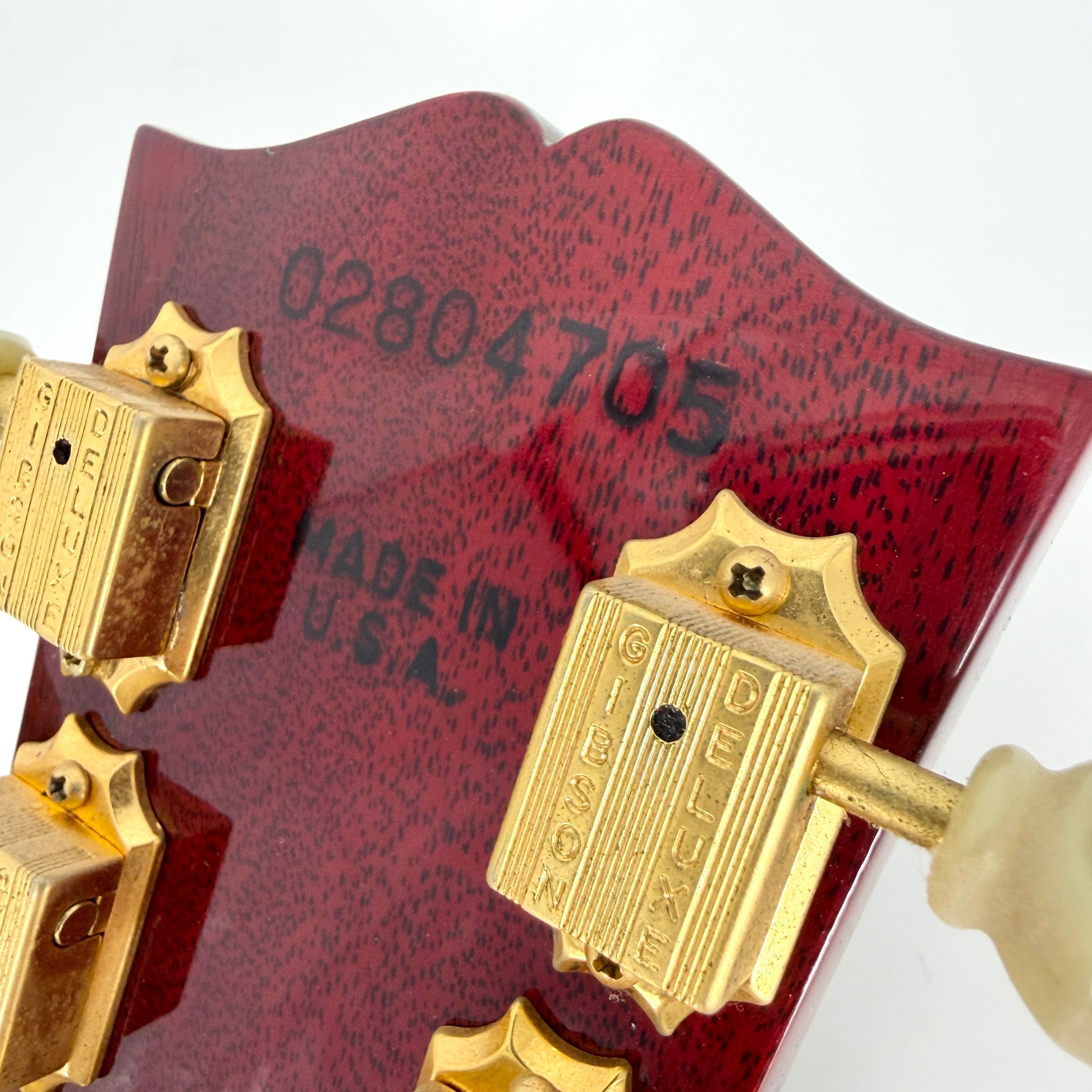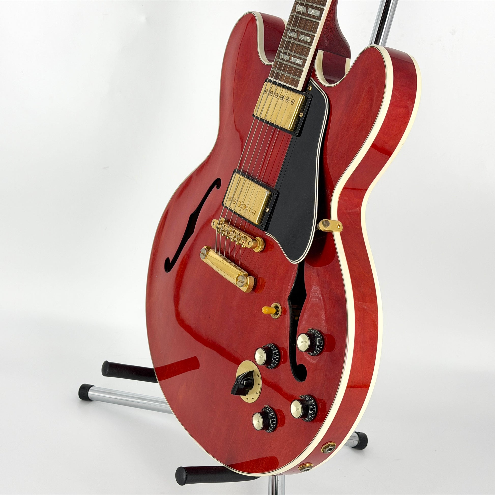 Features include a double cutaway semi-hollow Maple body with binding, arched Maple top with f-holes, Mahogany neck, 22-fret bound Rosewood fingerboard with split Pearl parallelogram inlays, Tune-o-matic bridge/stop tail, Pearl crown/logo inlay, Gibson deluxe tuners and gold hardware.
