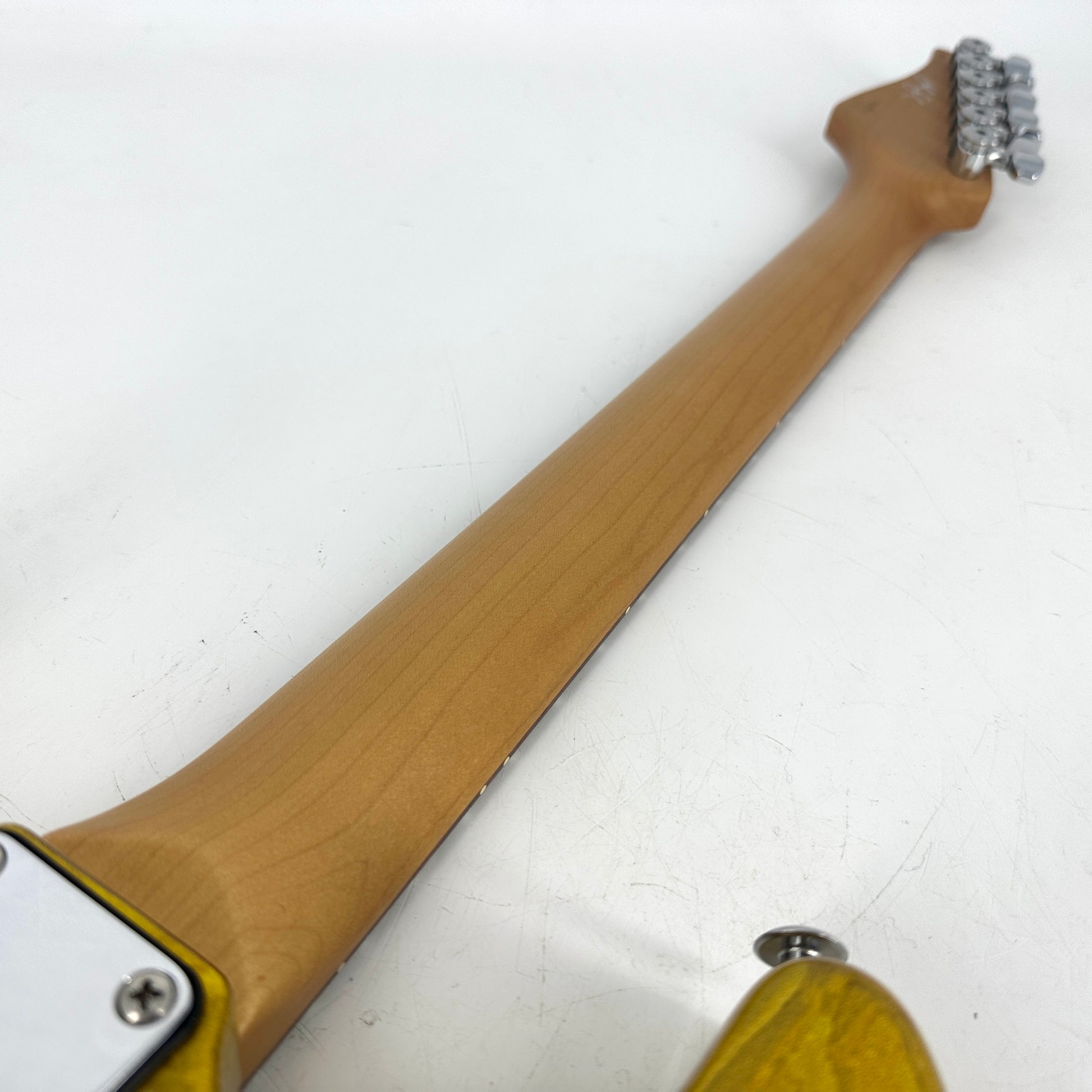 Features include a chambered Alder body, Maple neck with African Rosewood fingerboard, 10-14" compound radius and a comfortable even-C slim profile. It also has a 1.650 nut width, a trem bridge, Sperzel locking tuners, heavy frets, Tusq nut and a special order Abalone headstock logo.