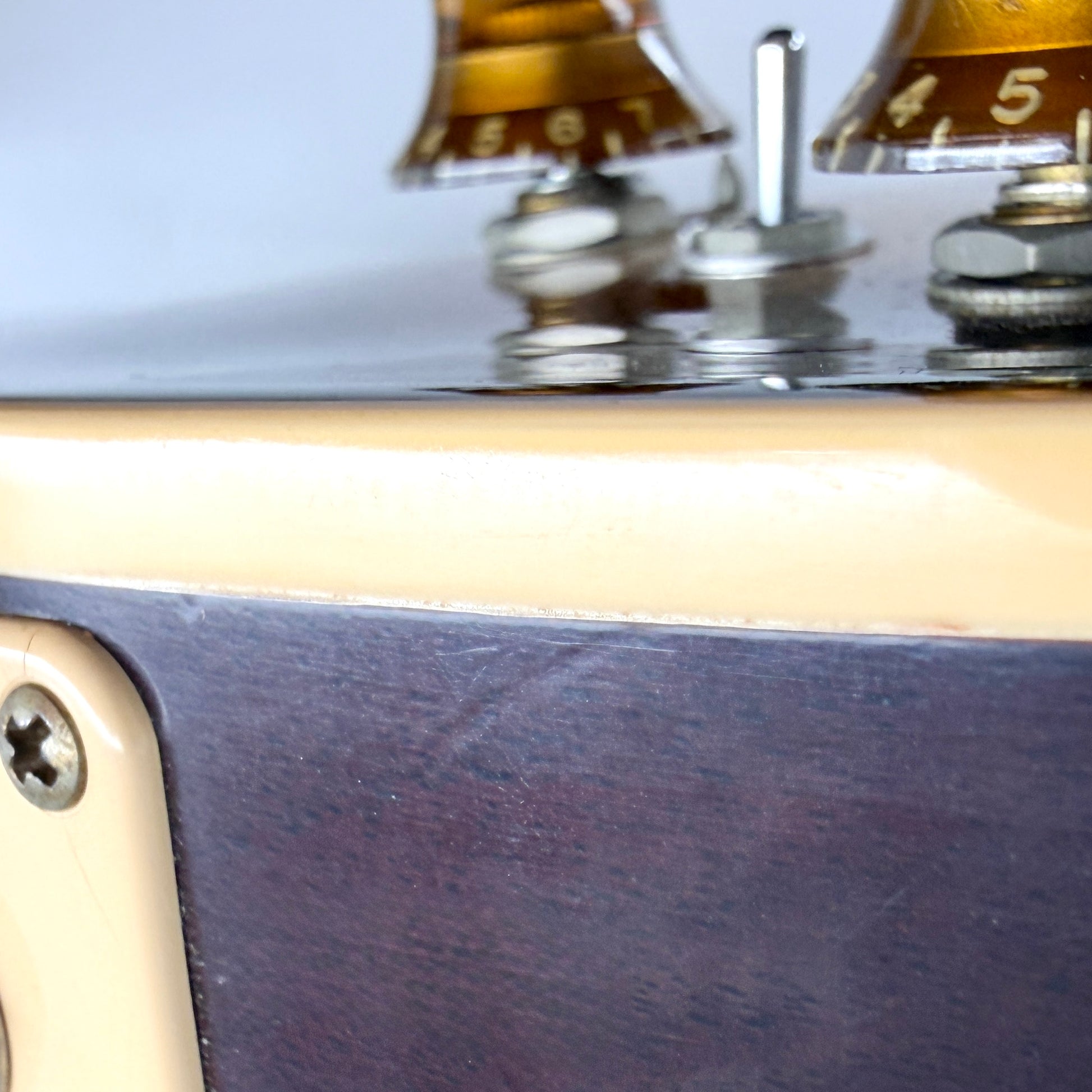 It features a traditional Mahogany body and maple top finished in a beautiful Dark Tobacco Sunburst finish. The Mahogany neck has a comfortable medium-chunky (not a bat) profile, a Rosewood fingerboard and Kluson tuners.