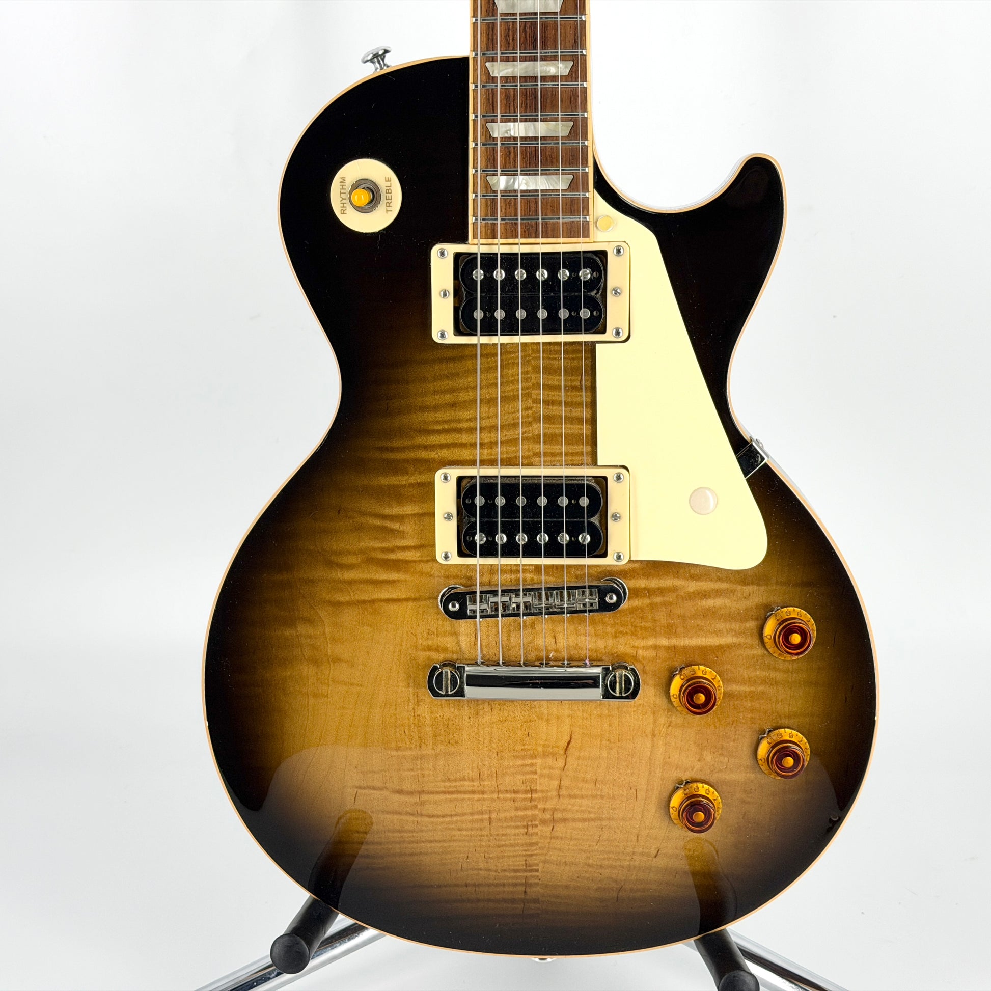 The Antique is actually closer in spec to a Les Paul Standard than a Classic and features a lightweight chambered body, and a headstock with binding and crown inlay. The body is Mahogany with a figured Maple cap, and it’s a Mahogany neck (comfortable slim profile) with Rosewood fingerboard and block inlays. It also benefits from upgraded Kluson locking tuners, and there are removable screw covers on the pickguard for a cleaner look. The '57 Classic / '57 Classic Plus pickups sound great - iconic Les Paul tone.