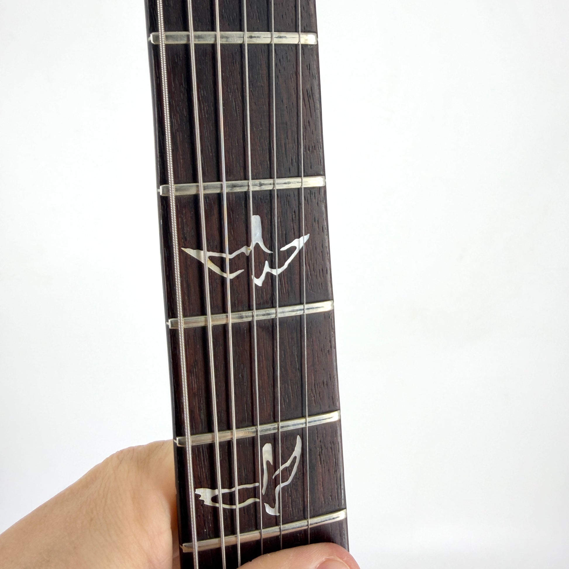 Features include a mahogany body and neck paired with a carved maple top, creating a tone that’s both warm and articulate. The HFS and Vintage Bass humbuckers offer an exceptional range, from smooth, singing sustain to aggressive bite, making it equally at home with pristine cleans or saturated rock tones. The wide-thin neck profile and flawlessly finished fretwork deliver effortless playability across the entire board, while the PRS tremolo system ensures perfect tuning stability through the most expressive bends. Finally is has gold hardware including locking tuners and a tremolo bridge.