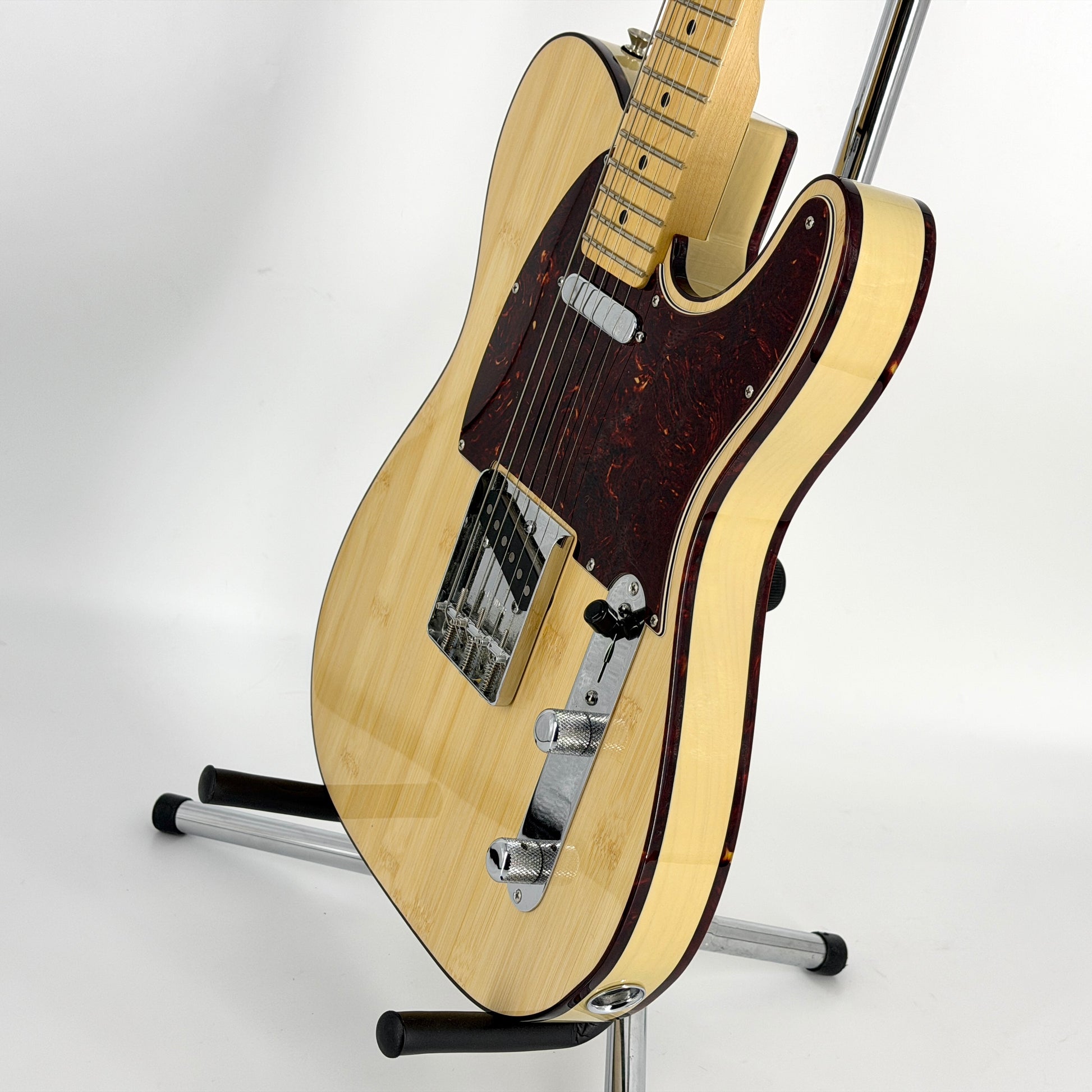 In addition to the beautiful Bamboo body with tort-shell binding, it has a comfortable C profile Bamboo neck with 9.5” radius fingerboard, sealed tuners tuners and 3-saddle bridge. Tone-wise you get a pair of USA Standard single coil pickups and 3-position switching for versatility.