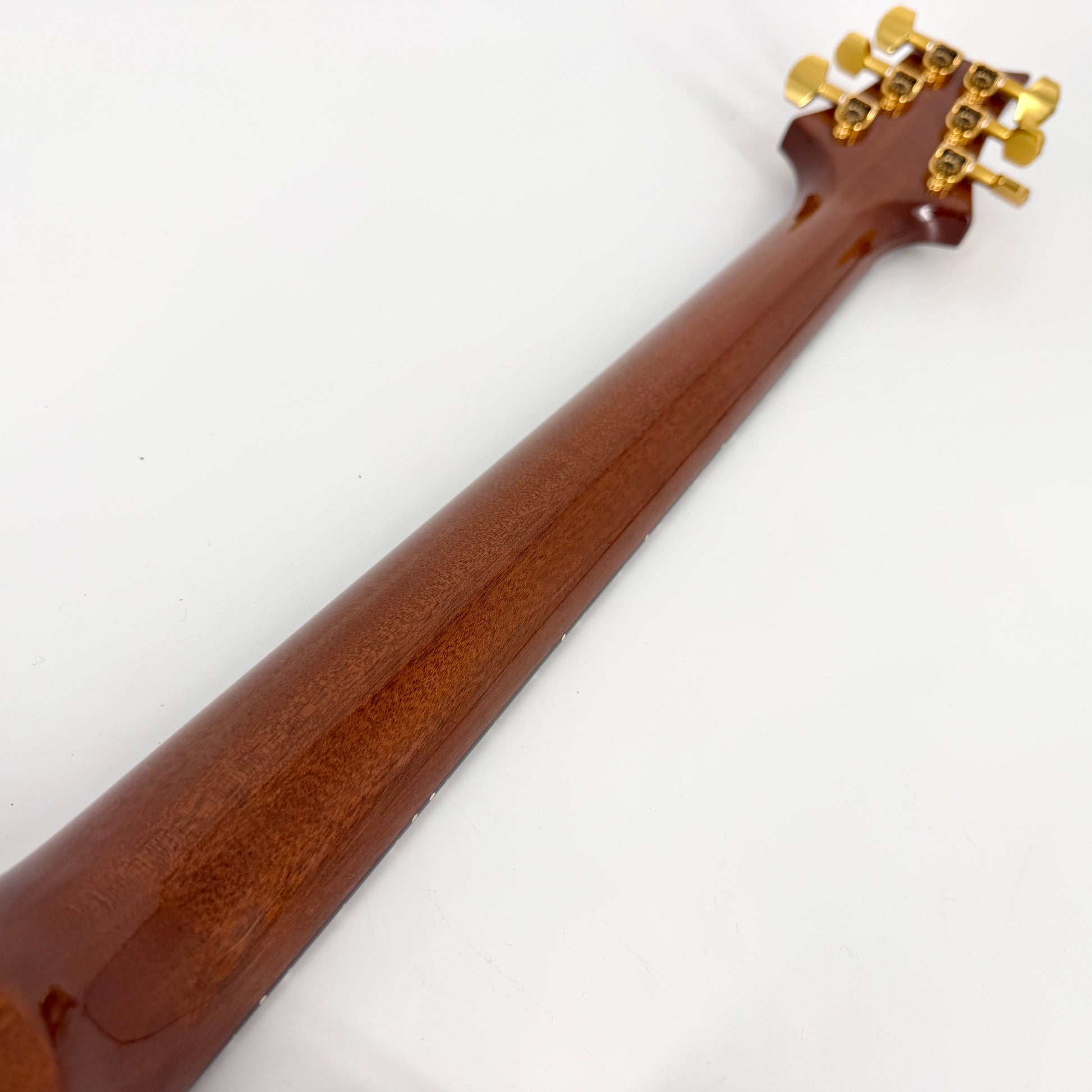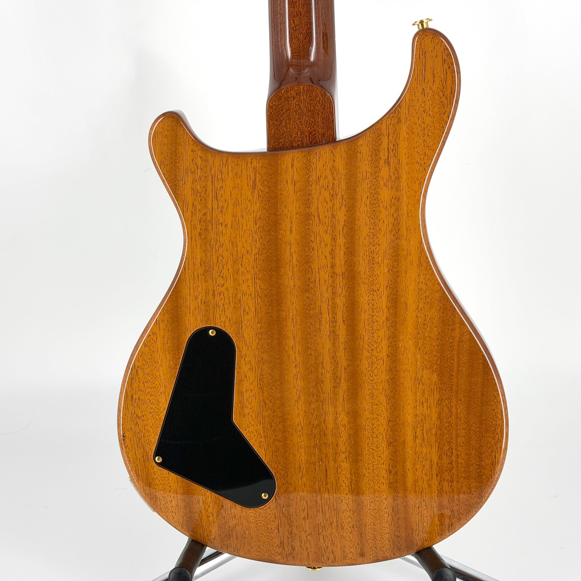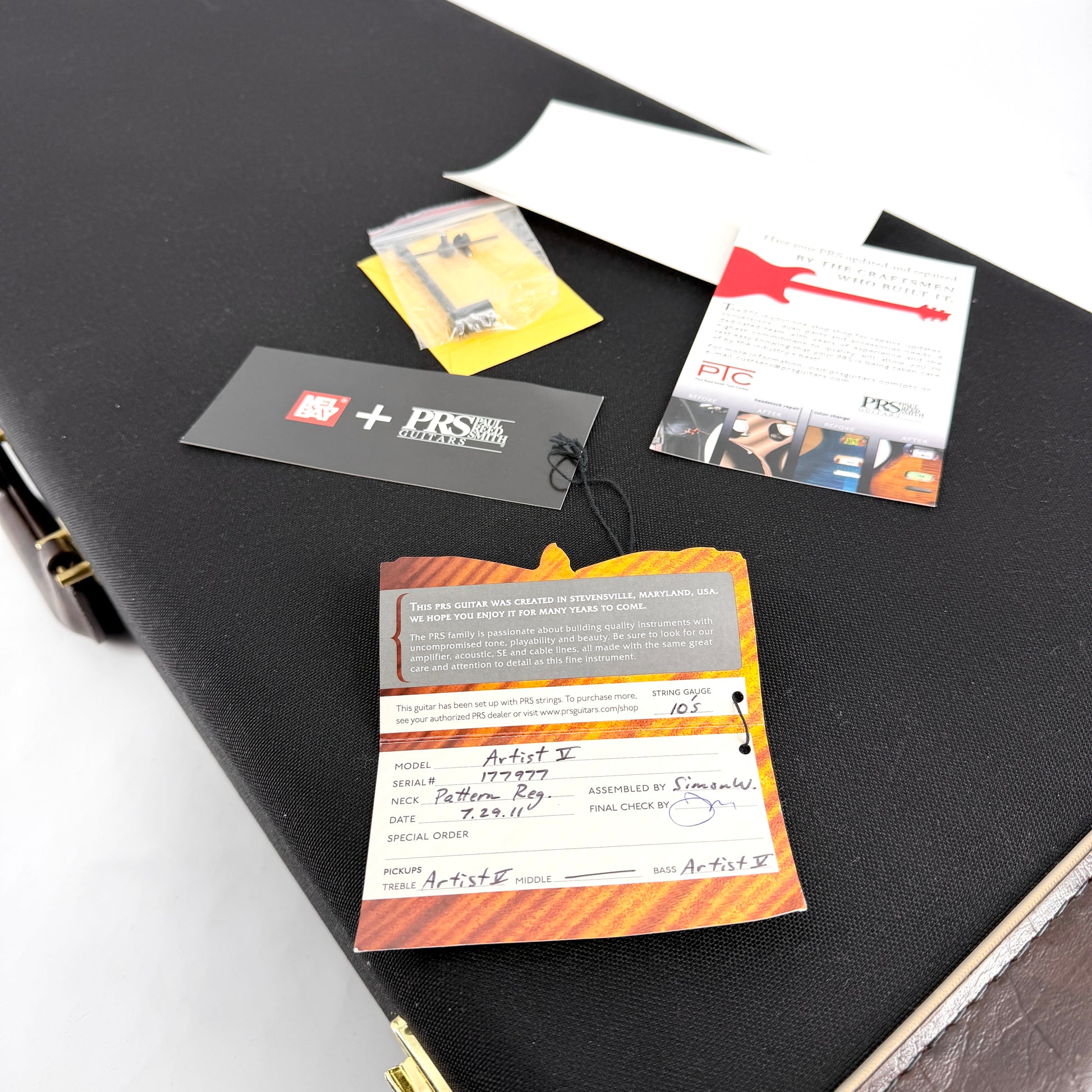 The tone-woods are all super premium and carefully selected, including Ribboned Mahogany for the body with V12 finish, a Peruvian Mahogany neck with a comfortable 'Pattern Regular' (medium) profile. The 22-fret bound fingerboard is Gaboon Ebony with Mother of Pearl Purfling, Paua Birds with Mother of Pearl. The headstock Inlay is Ebony with an Abalone Signature and Mother of Pearl “Artist V”. It has gold hardware, including a PRS stoptail and PRS Phase III locking tuners.