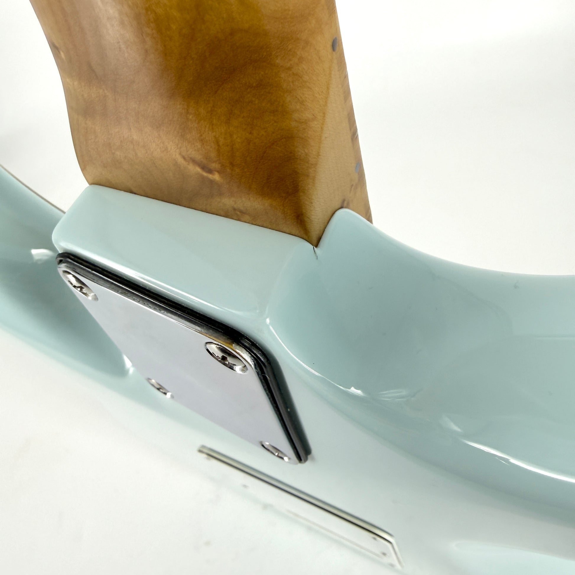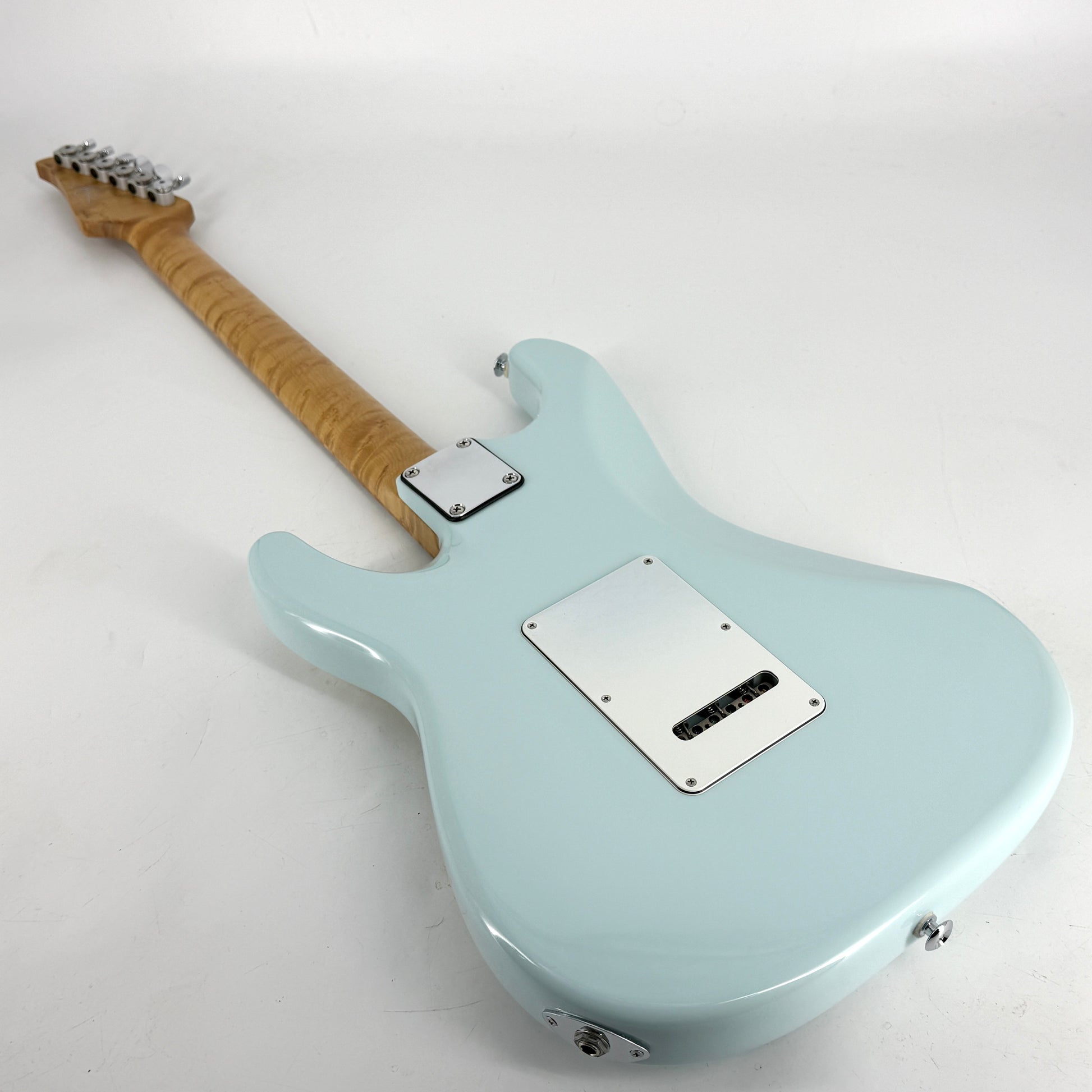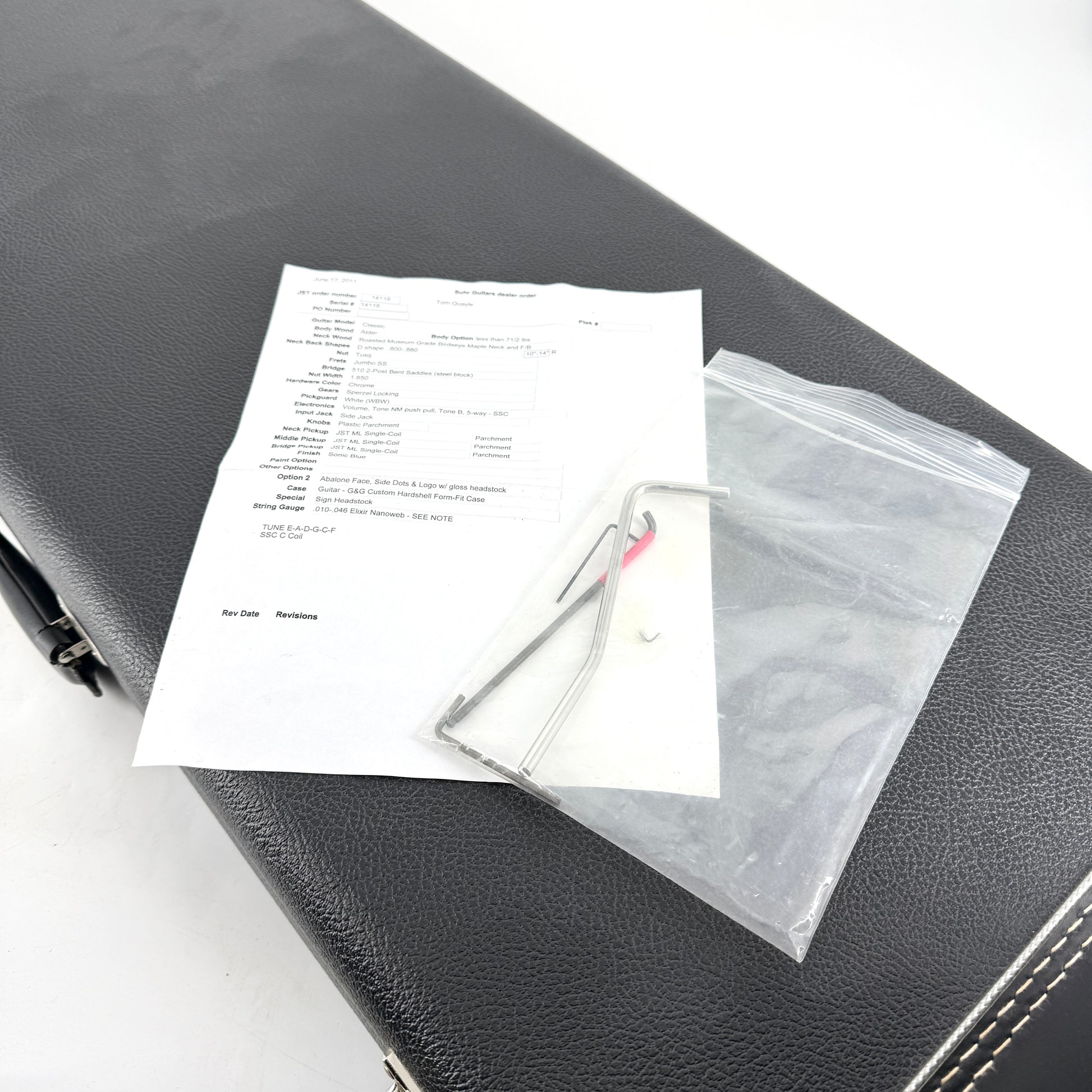 It's in excellent condition with 1 blemish on the edge as pictured. It features an Alder body, Museum Grade Birdseye Roasted Maple neck/fingerboard with a comfortable D shaped profile, jumbo stainless steel frets, 10-14 compound radius, decorative Abalone dot inlays/decal and hand-signed headstock. It has a Gotoh 510 tremolo bridge for excellent sustain and Sperzel locking tuners. It has a JST ML single coil pickups for classic strat tone, 5-way switching for tonnes of versatility and push/pull SSC for quiet operation.