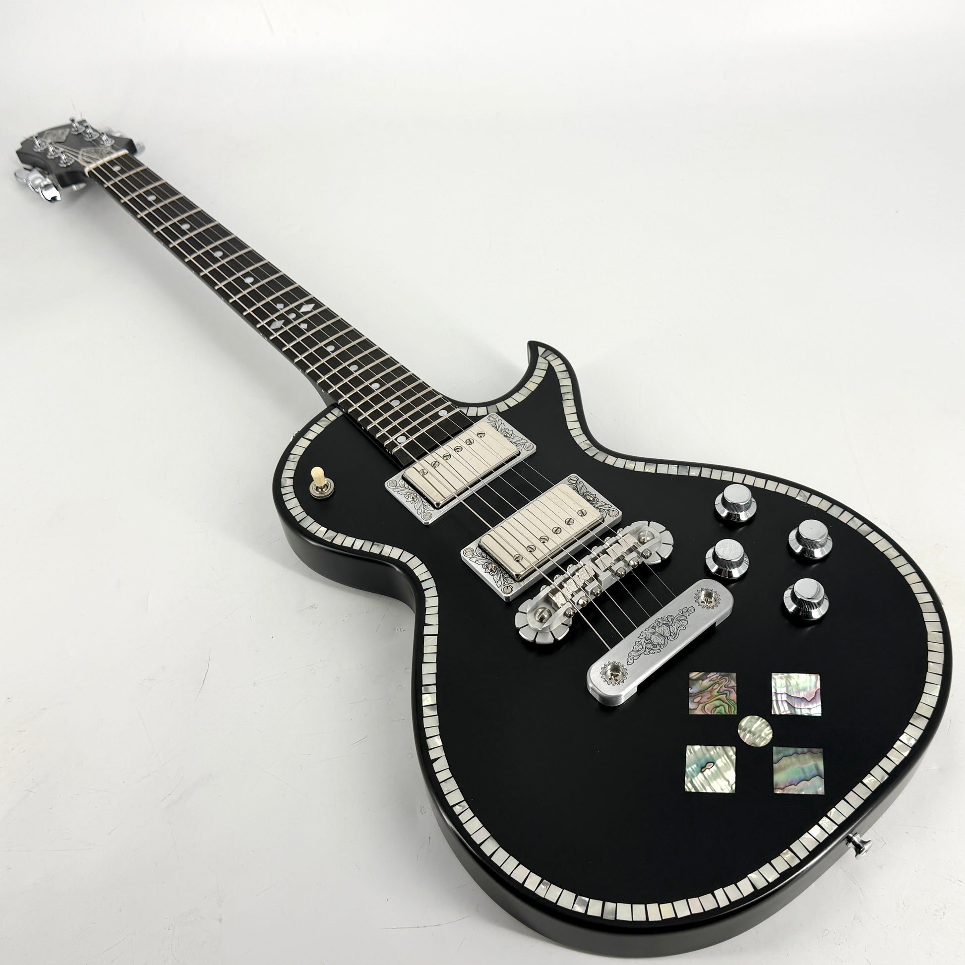 This particular model is adorned with the tiles of Mother of Pearl that were hand cut and placed by the master luthiers at the Zemaitis Japanese factory for a perfect fit. It has engraved hardware including the tailpiece, truss rod cover, logo, jack plate, back plates and pickup rings. Other features include a Mahogany body and chunk profile neck, Ebony fingerboard with 12” radius and Schaller M6 tuners. Satin nitrocellulose lacquer finish and DiMarzio Custom PAF DP103 pickups. The custom Zemaitis bridge and tailpiece are not only great looking, but highly functional and add tone and sustain!