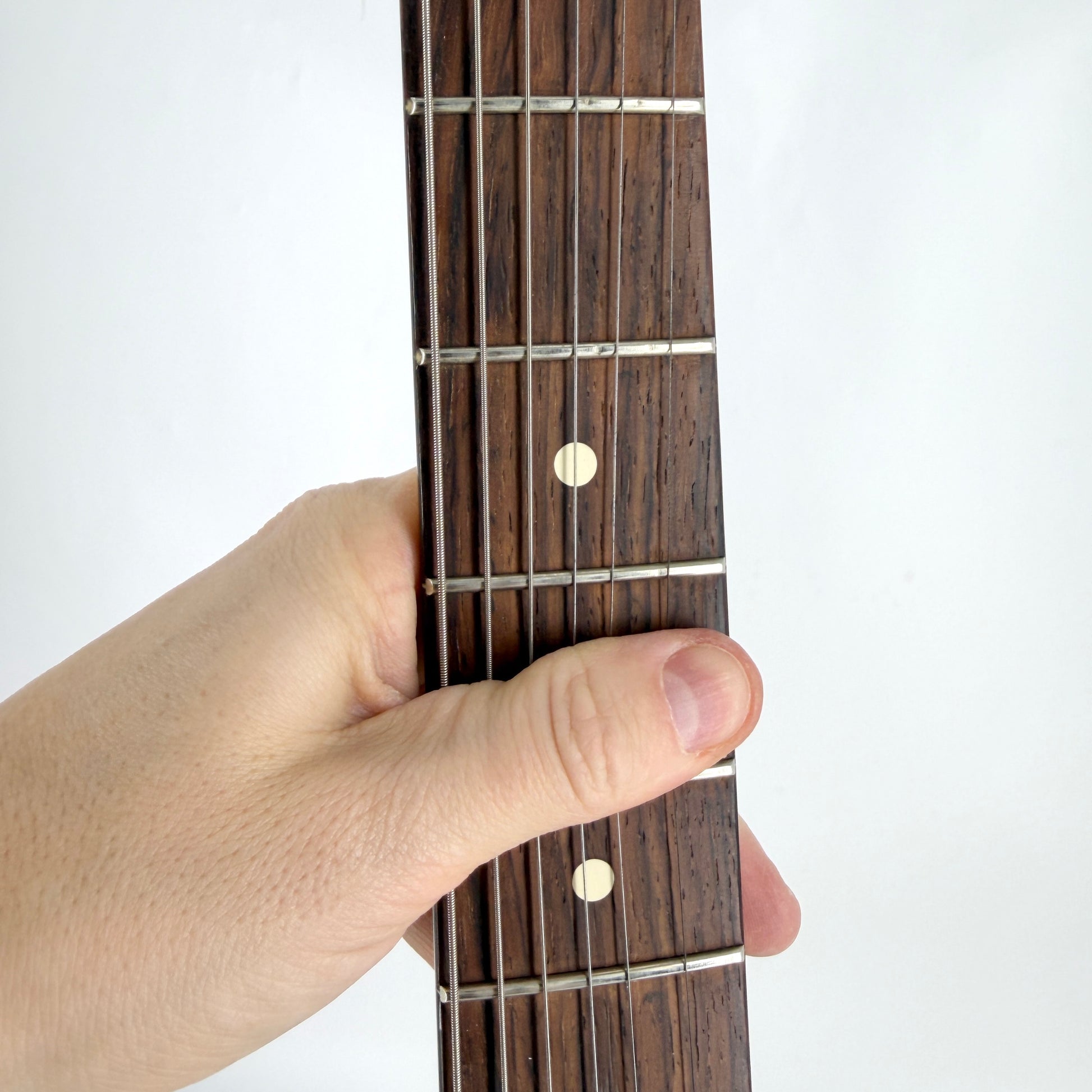 It's in very good condition with various surface blemishes and signs of wear on close inspection. The frets have minor wear but cosmetic only and lots of life left in them. Everything works as it should without issue.