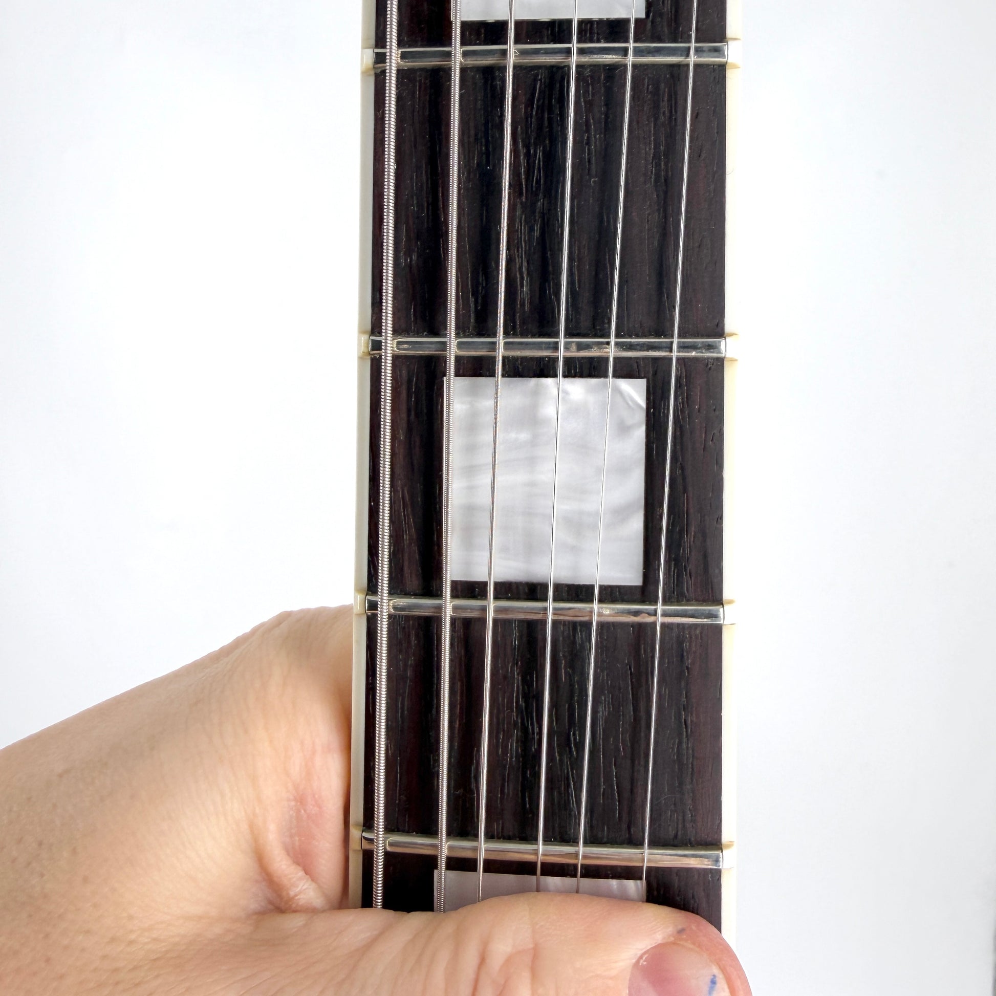 The set Mahogany neck is carved to a comfortable (medium-chunky) profile and topped with a dark Rosewood fingerboard complete with mother-of-pearl block inlays, giving a premium feel and smooth playability across all 22 frets. The nut has been upgraded to a premium brass nut, but the original is also included. A pair of Gibson 490R and 498T humbuckers provide rich, expressive tone with plenty of bite when pushed into overdrive.
