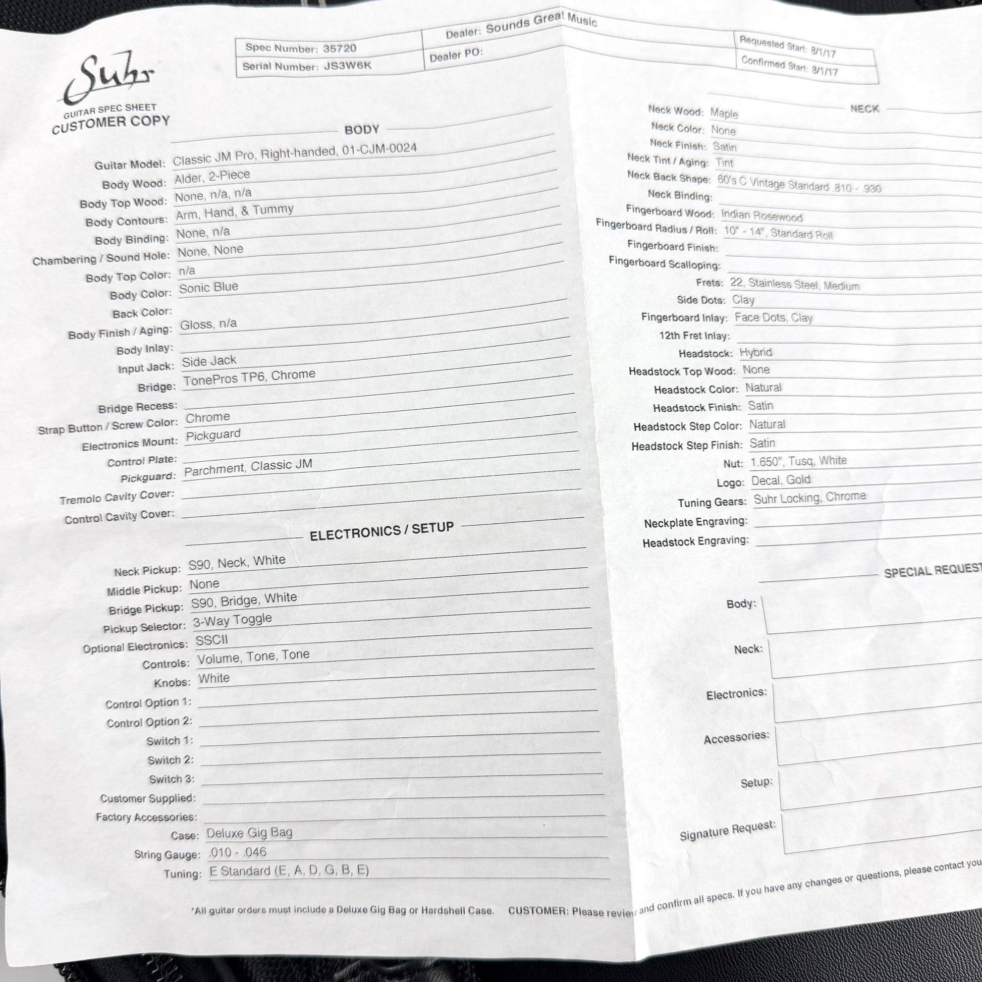 Stunning Suhr Jazzmaster finished in Sonic Blue and in near-mint condition (just a couple of tiny blemishes on the top of the headstock as pictured).