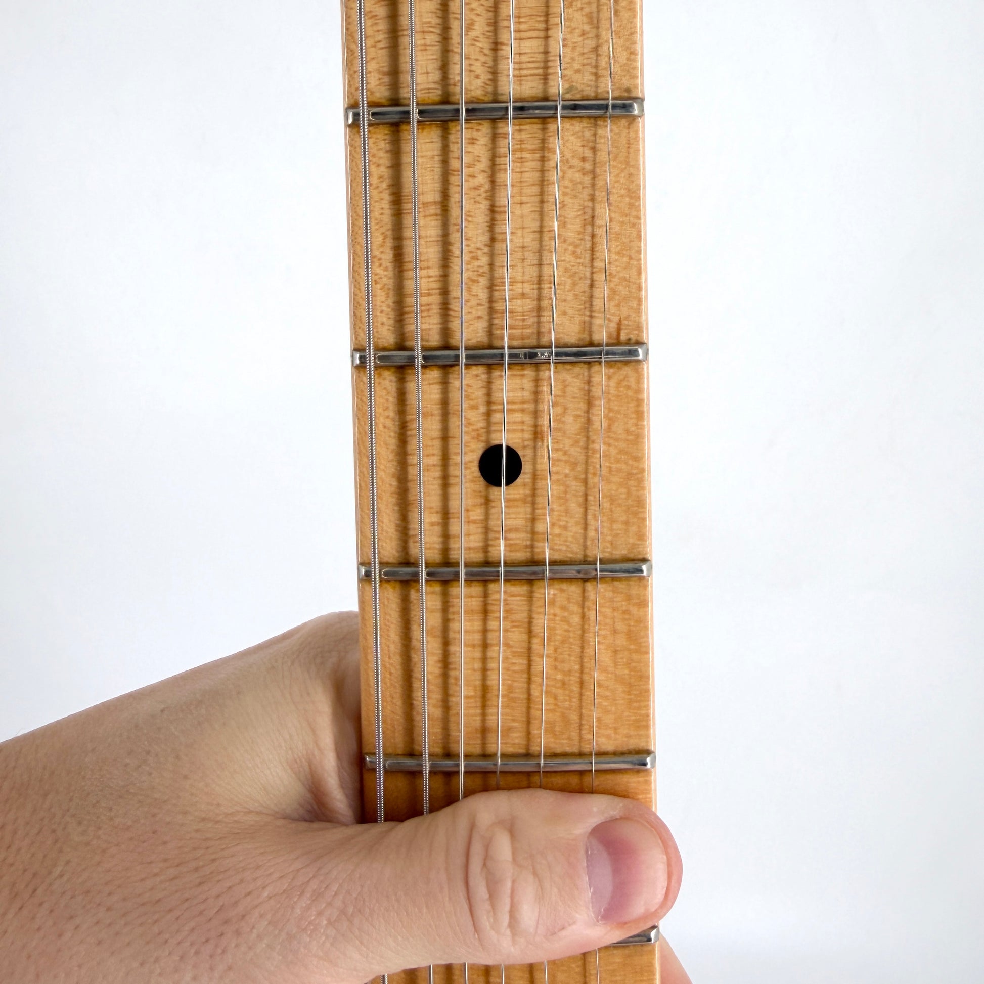 It features an Alder hollow body with a comfortable 63 strat style C profile, rift-sawn Maple neck, compound 9.5” radius fingerboard, Sanko 6105 frets, F-stamp tuners, tremolo bridge, limited edition backplate/headstock decals and black paisley pickguard. Tone-wise you get a trio of premium handwound single coil pickups - a Texas Special at the bridge, Fat 50s in the middle, and a '69 at the neck.