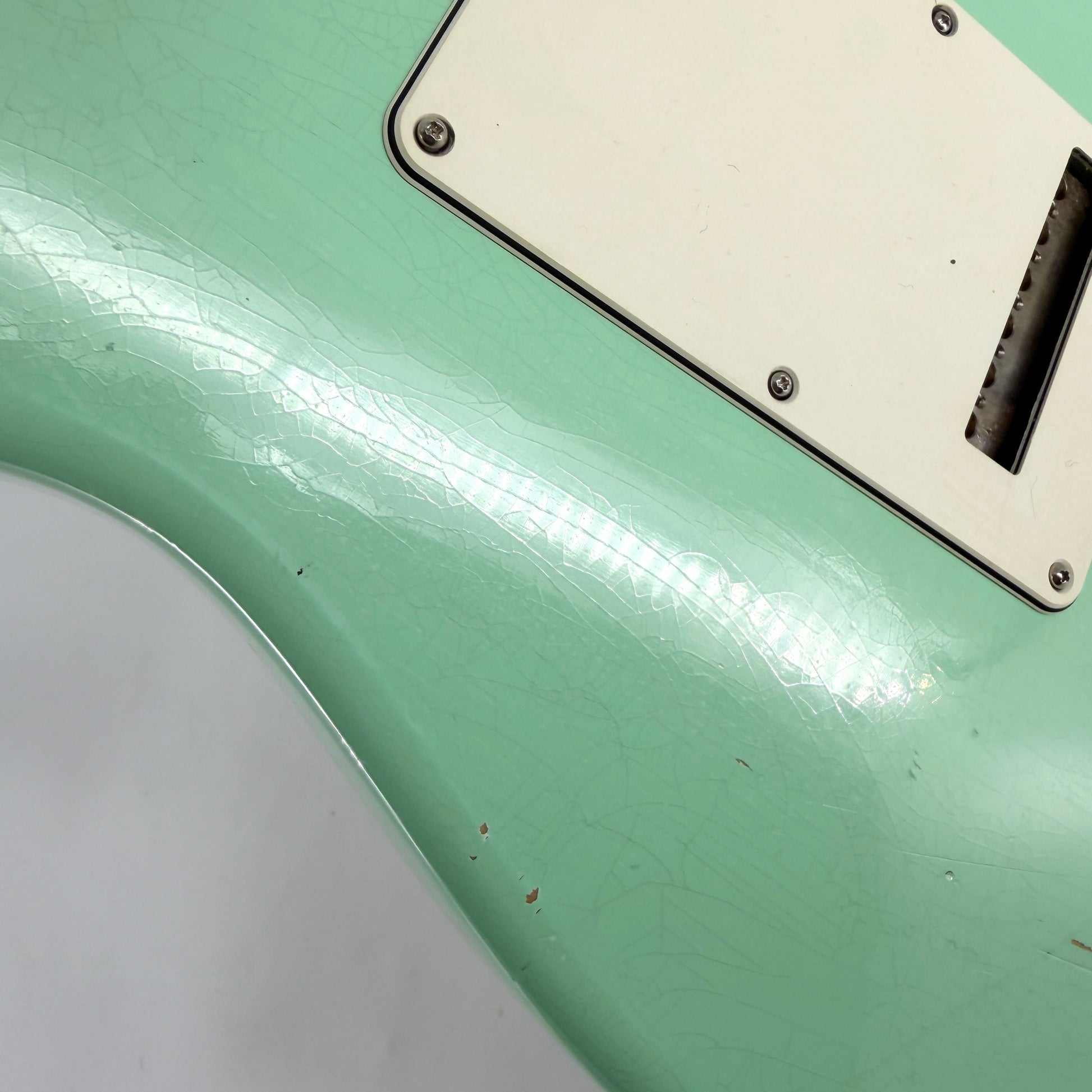 It has a factory relic finish and is covered in lacquer checking (which we've tried to highlight by bouncing light off the surface in a couple of the photos). It has a couple of small holes in the body as pictured, everything works as it should without issue.