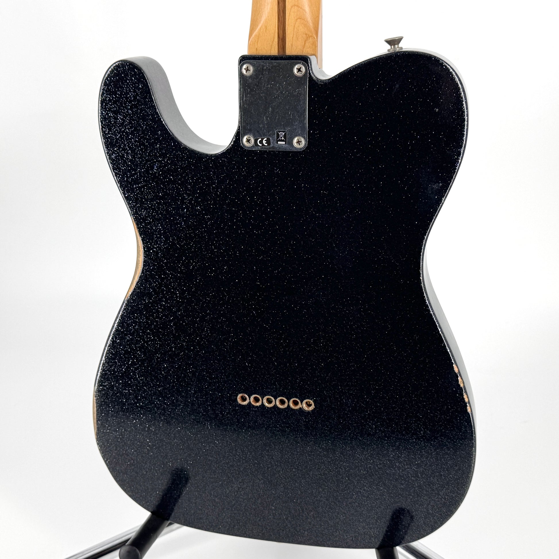 It features a paulownia and spruce body finished in a stunning black sparkle Road Worn lacquer, a custom Enhanced "V"-shaped maple neck with a 9.5" radius fingerboard and vintage-style aged hardware, including 3-saddle string-through Tele bridge with compensated brass barrel saddles and vintage tuners.