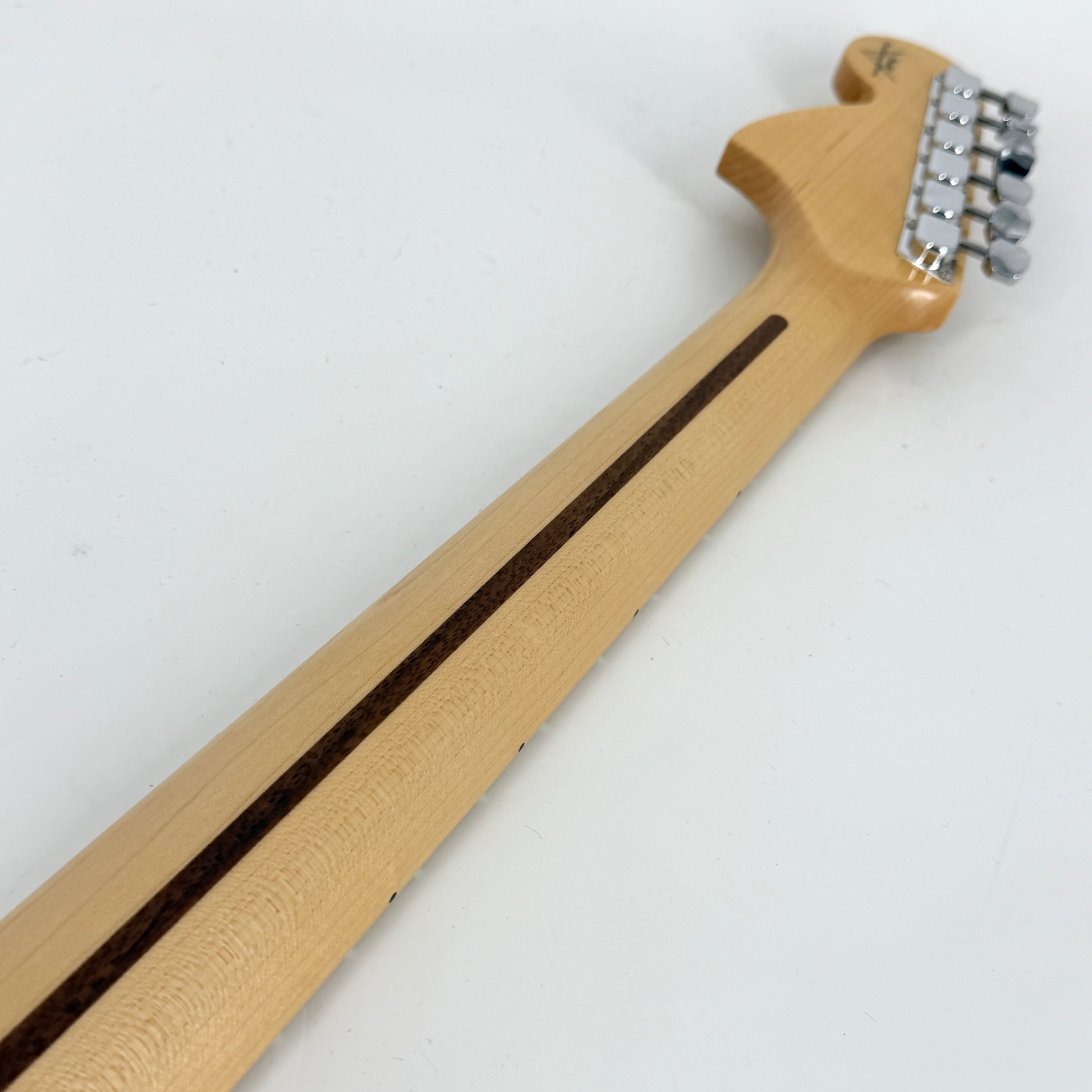 Features include an Alder body, a comfortable ’69 U-profile maple neck, 9.5” radius and 21 narrow/tall frets, and American vintage 6-saddle vintage trem and tuners. It has hand-wound 69 single coild pickups which sound fantastic and a 5-way switch for versatility.