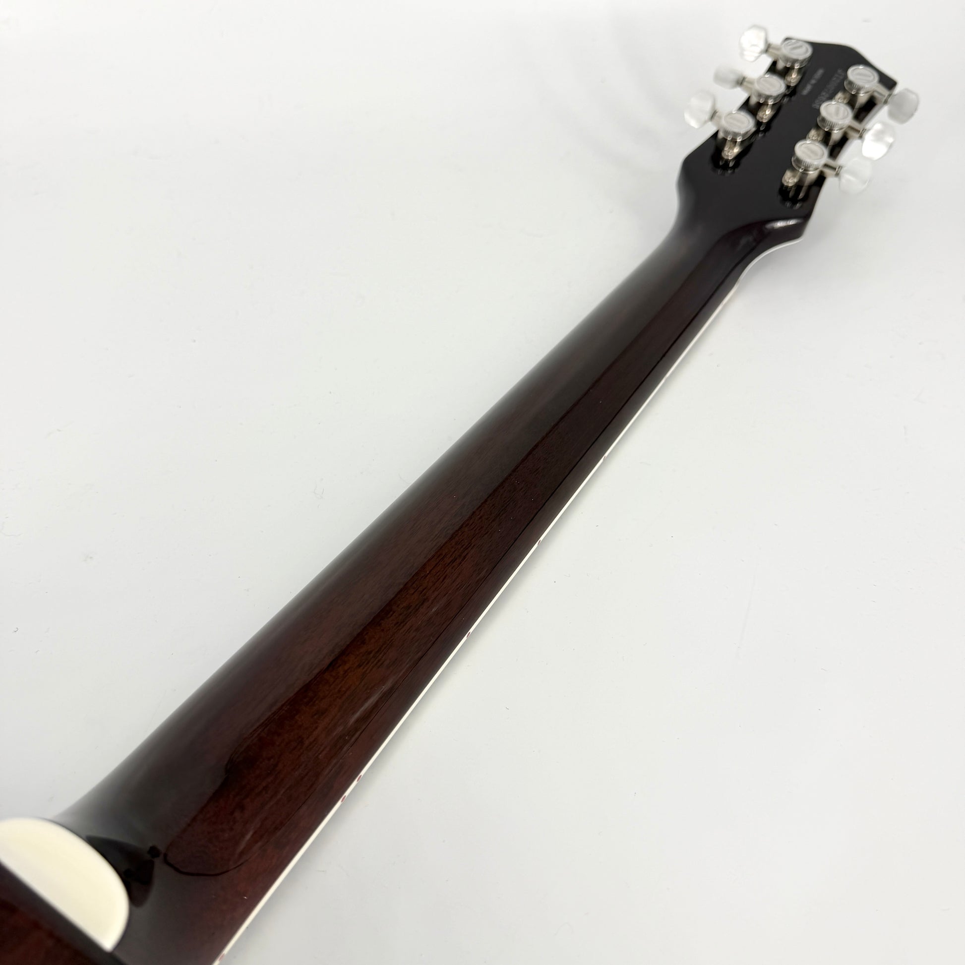 Responding to player needs for increased comfort, the Jet DS features a lowered neck set that greatly improves fret-hand mobility while also giving the picking hand a closer approach, increasing comfort and accuracy. The new full-access rolled cutaway and tapered heel allows the free access to upper frets without awkward pivoting or palm obstruction. This sleek design remains hidden, preserving a vintage aesthetic - a critical feature that is meant to be felt, not seen. It has a 12" radius and a comfortable (fairly slim) profile, alongside a string-thru bigbsy and gotoh locking tuners.