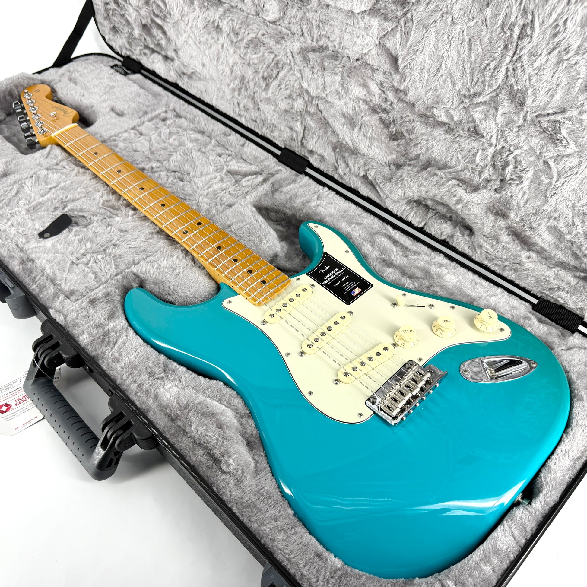 Fender USA Professional II Strat - finished in Miami Blue. It still has its plastic wrap over the pickguard and would be in 'as new' condition were it not for a tiny, barely visible blemish on the edge, as photographed.