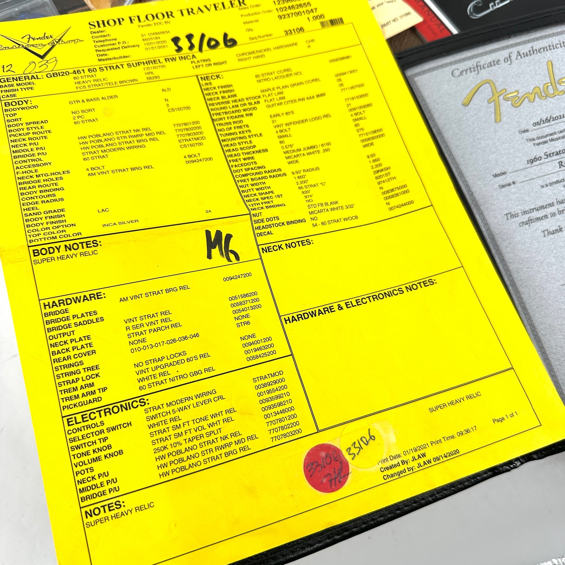 It has a huge spec (see Shop Floor Traveller pic for details) but highlights include an Alder body, silky smooth aged Maple neck with comfortable 65 'C' (medium) profile, Rosewood fingerboard with 9.5” radius, Medium jumbo frets, and aged vintage style tuners/bridge.
