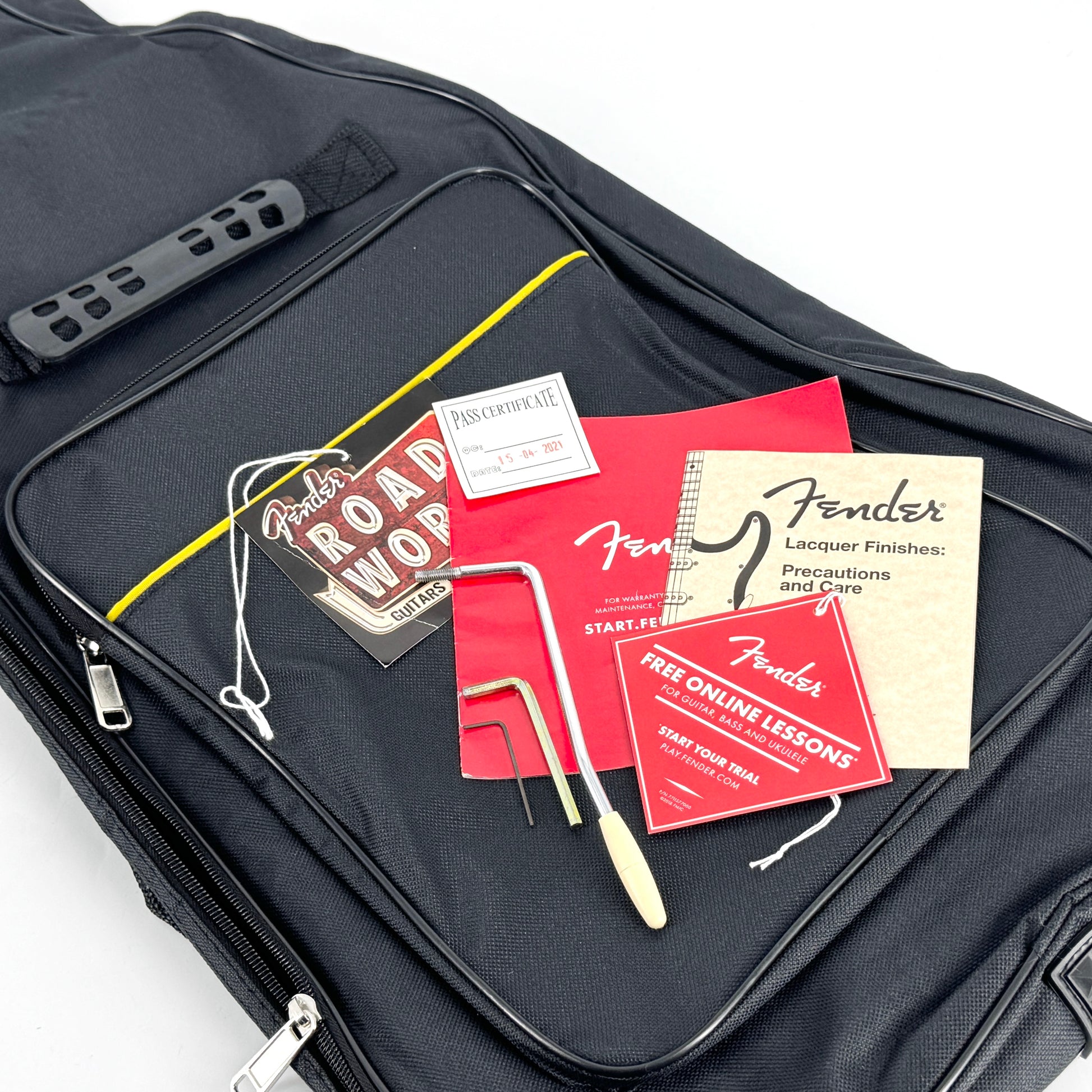 It has 3x vintage-style 60’s hot single coils for classic strat tone, volume/tone controls and 5-way switching for maximum versatility. It is sold with a gig bag for easy transport and comes with its trem arm and paperwork as pictured.