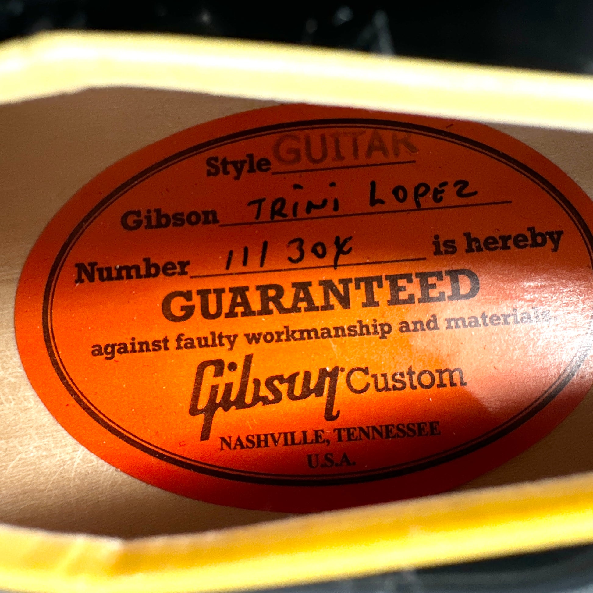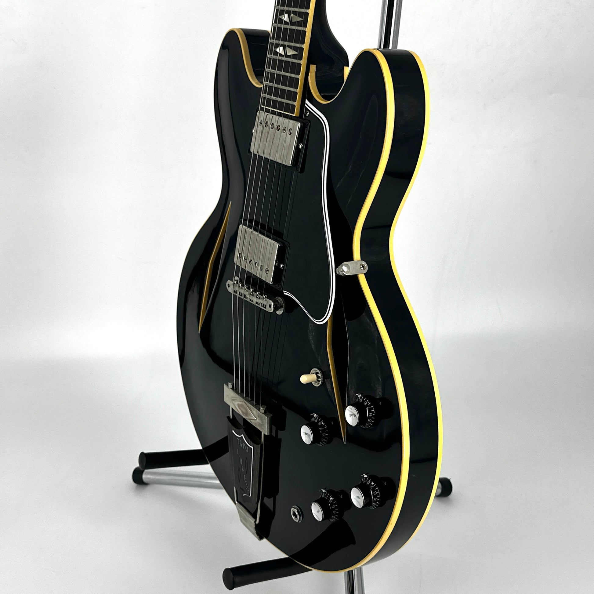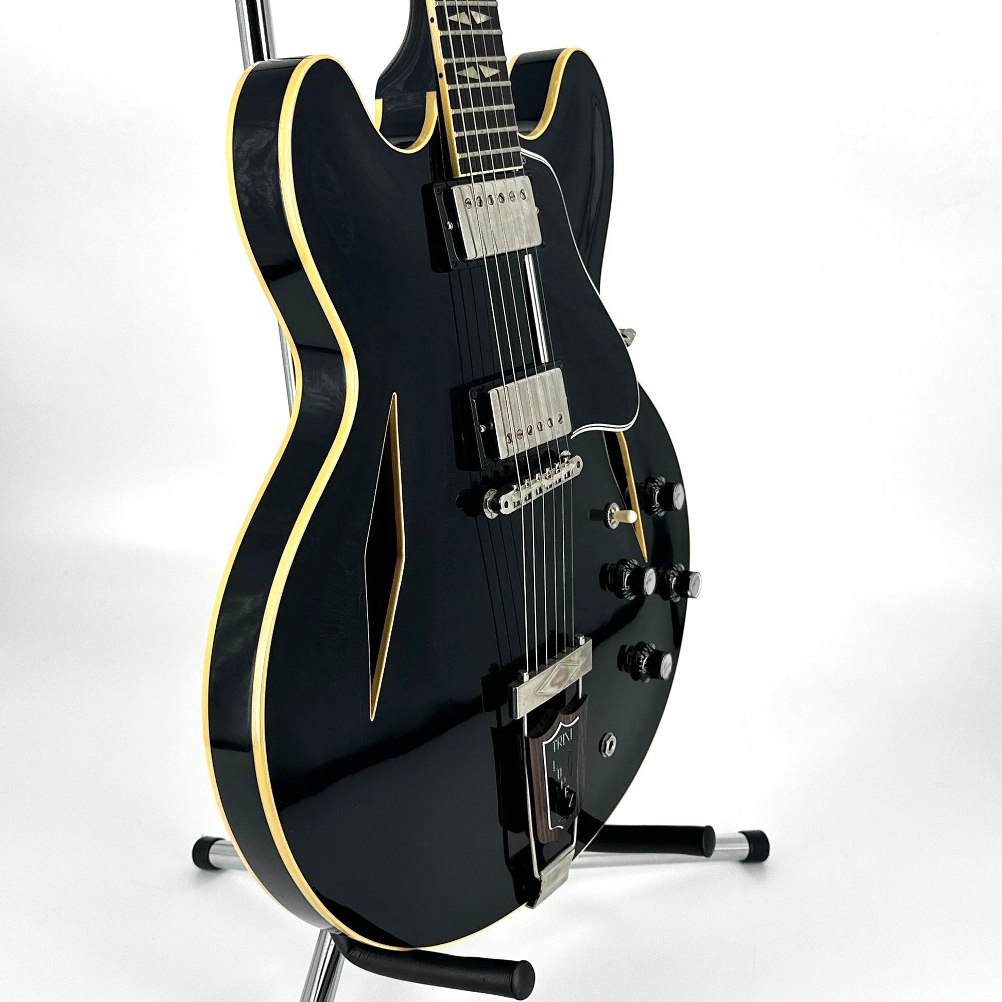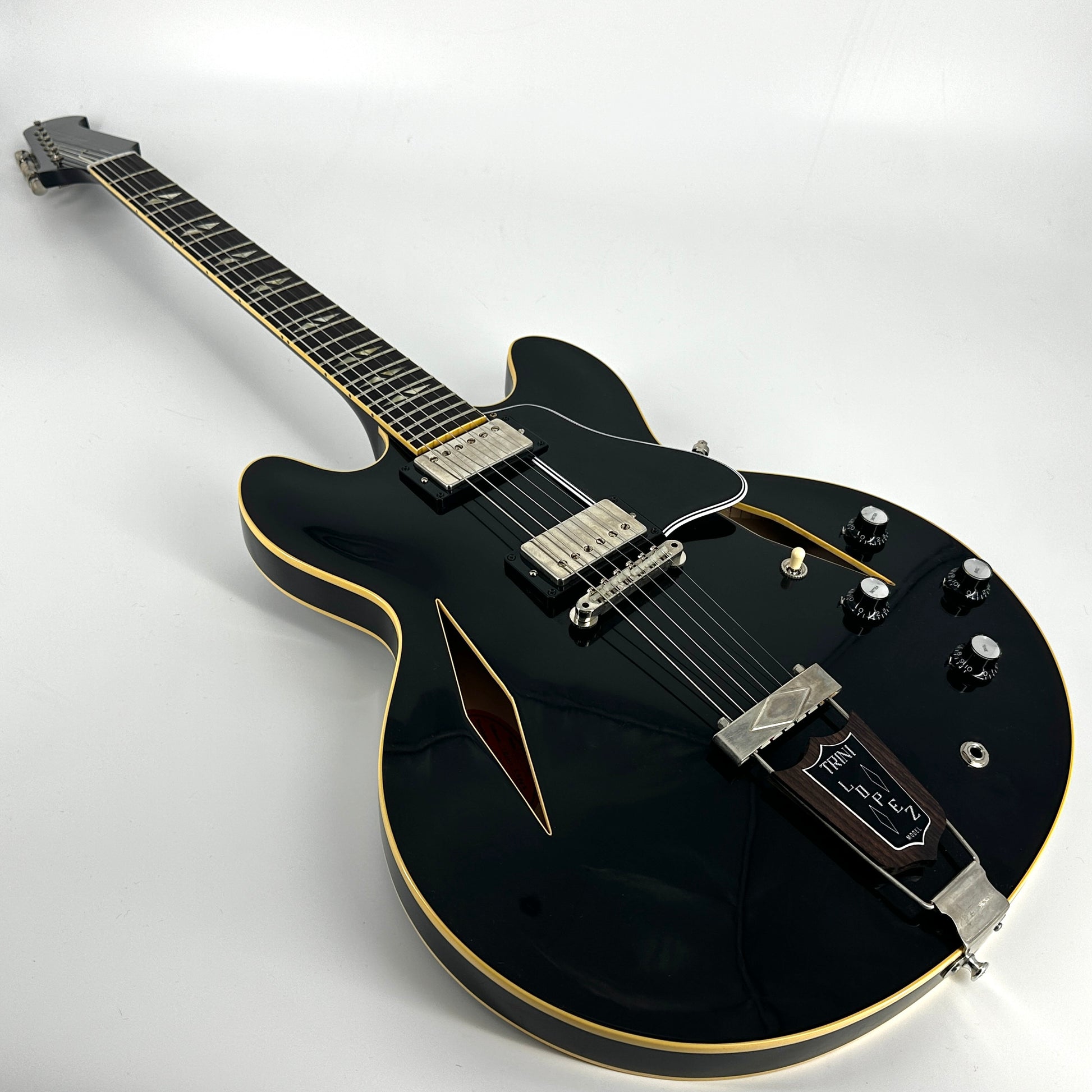 The Trini Lopez has many distinctive features including diamond f-holes, diamond inlays, rolled vintage neck binding, period correct appointments, Trapeze tailpiece with Indian Rosewood insert and Trini Lopez badge, 60’s Kluson ‘six on a strap’ tuners and the classic headstock design used on the Firebird.