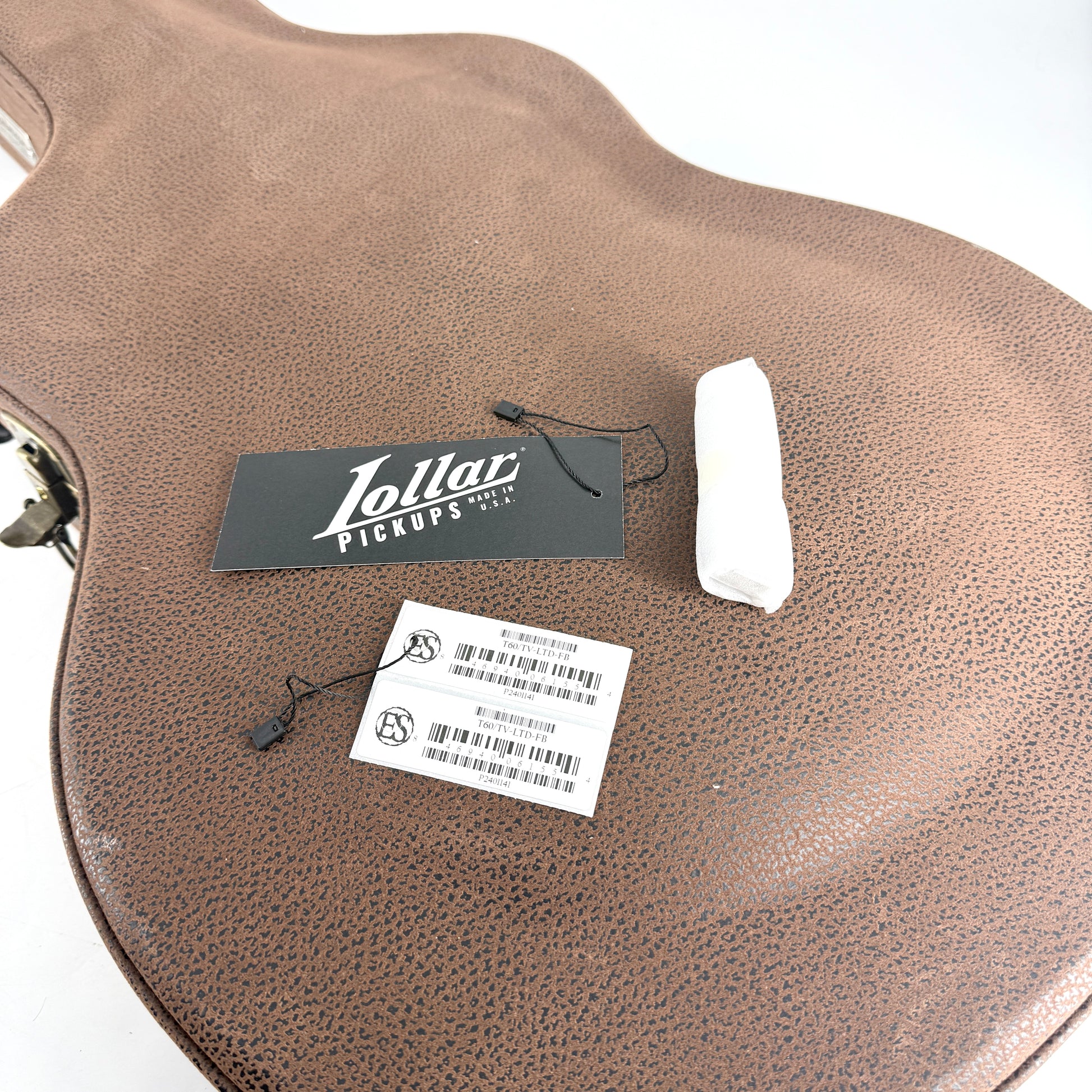 The body of the T59/TV boasts a sleek 16" thinline design, combining elegance and versatility. It is crafted with deluxe flamed maple laminate on the top, back, and sides. and the single-acting truss rod ensures optimal neck stability and adjustability, allowing you to tailor the instrument to your unique preferences. It features the unique Truetone Vintage Gloss finish - a perfect blend between a relic and a non-relic instrument. It boasts the same vintage vibe as the hand-aged Antique Varnish series, but without heavy wear and tear. The thin poly finish, inspired by Dana Bourgeois, allows players to naturally create their own marks over time. With top-notch aged hardware and premium Lollar Custom Wound Imperial Humbuckers pickups boutique it's a quality and great value package. It comes with its original hard case to keep it protected.