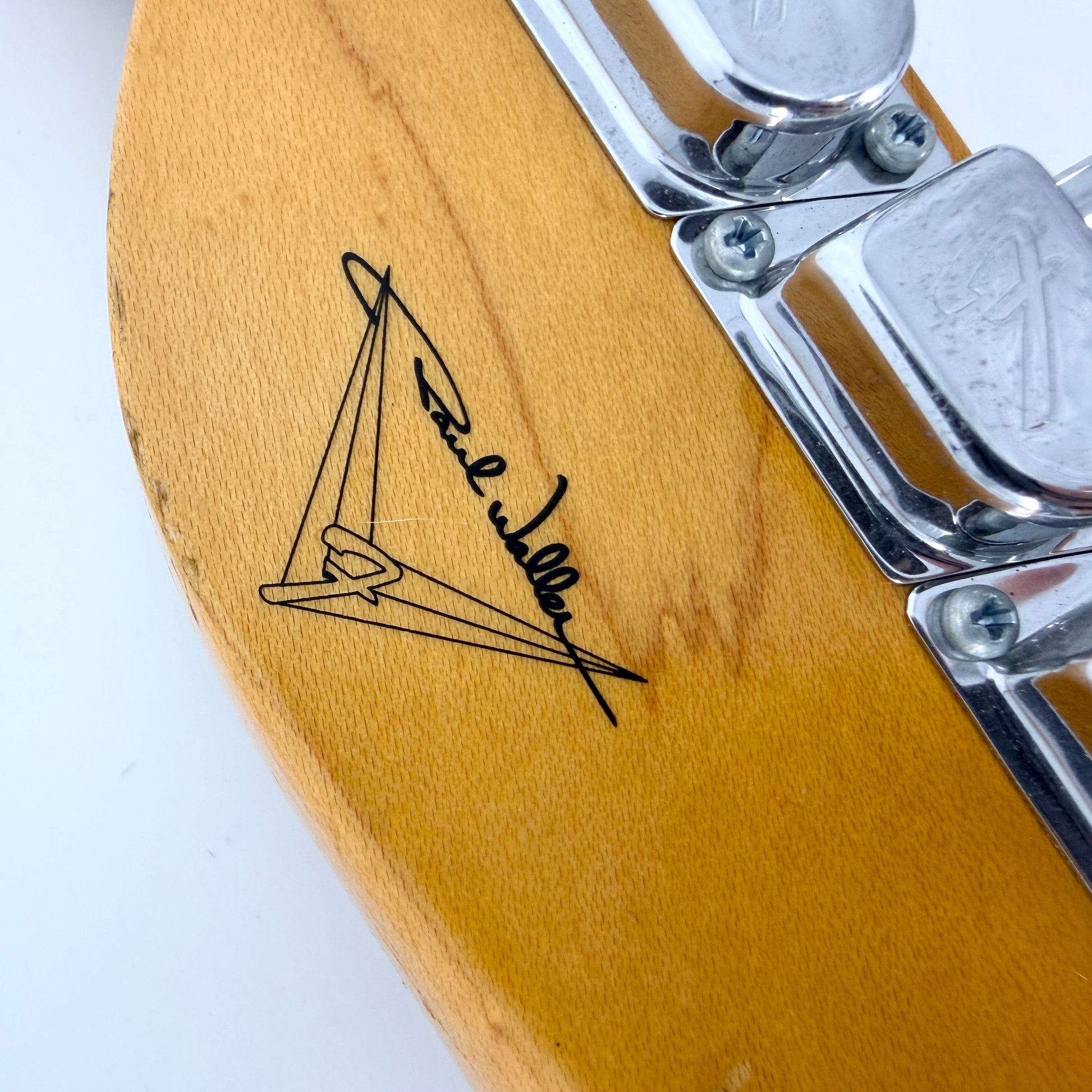 The electrics include a handwound original black guard single coill pickup in the bridge position that has tons of power, and a rare Paul Waller handwound custom humbucker at the neck. It's super versatile thank to it's 2 volume control, 1 tone and then 1 control for the Clapton circuit which is hidden under the pickguard with a new 9v battery. This provides an awesome midboost which adds thickness and gain without the need for a tubescreamer (or similar style) overdrive pedal.