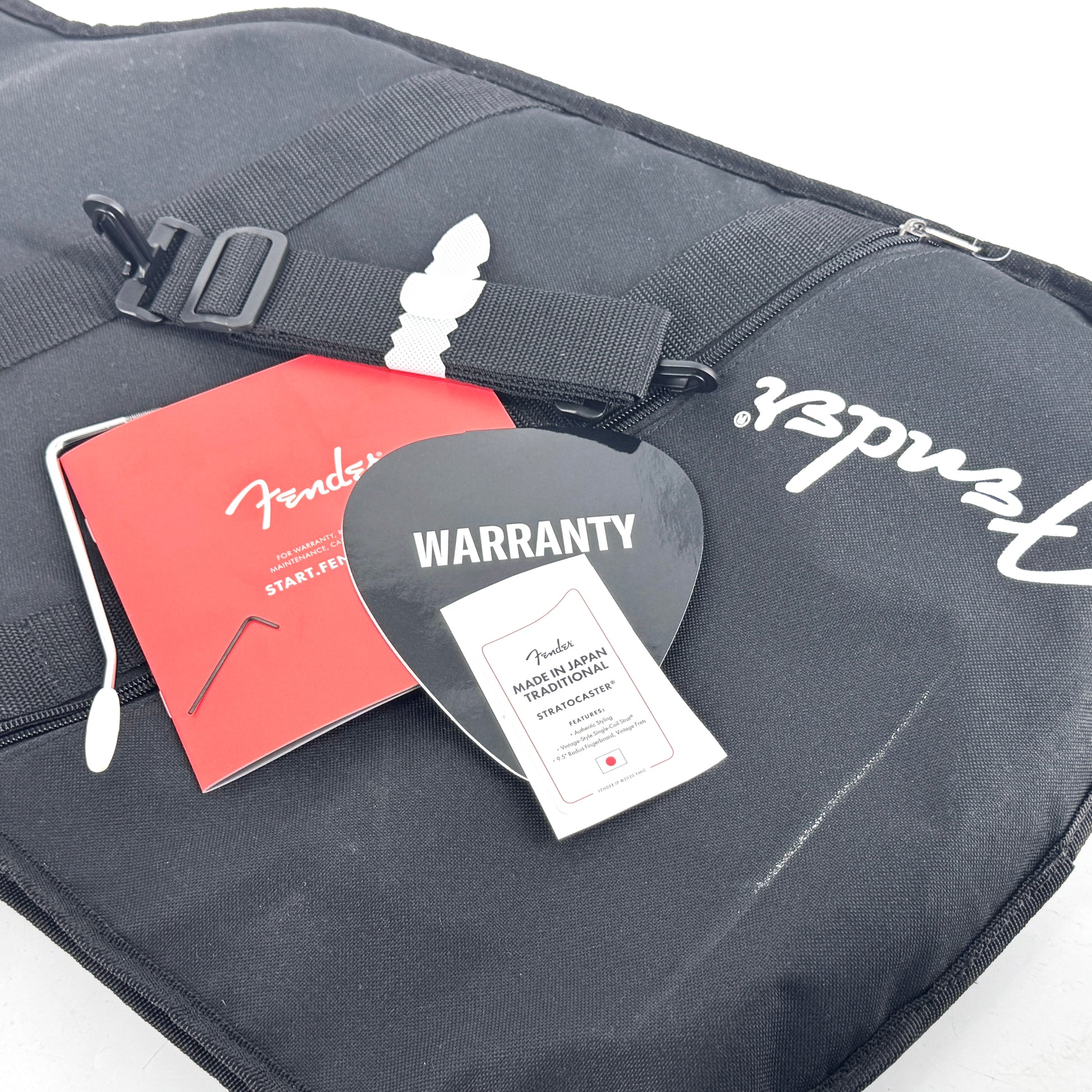 It comes complete with its trem arm and paperwork, and we have added a Fender gig bag to keep it protected.