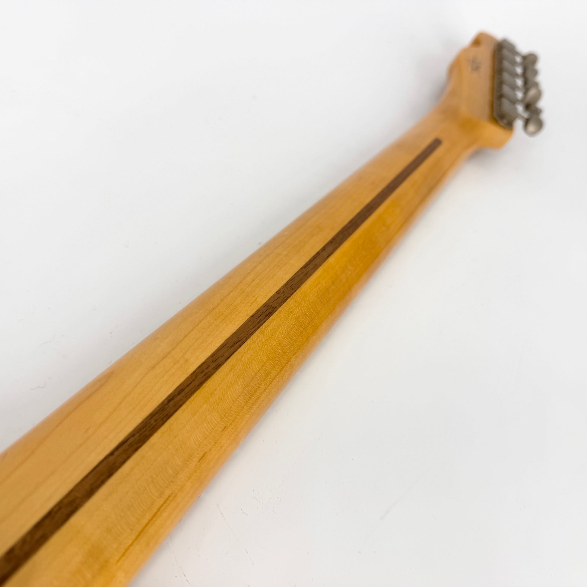 It is completely covered in lacquer checking which looks fantastic when it catches the light, and that we've tried to illustrate in a couple of the images. It has a premium and lightweight Ash body, a comfortable, 52 U profile Maple neck (a medium profile rather than particularly chunky), 9.5” radius, narrow frets, and vintage style tuners and bridge. It has a handwound Twisted Tele single coil pickup at the neck position and a handwound Loaded 51 single coil at the bridge position. It sounds fantastic and has a volume/tone controls and 3-way switching for versatility.