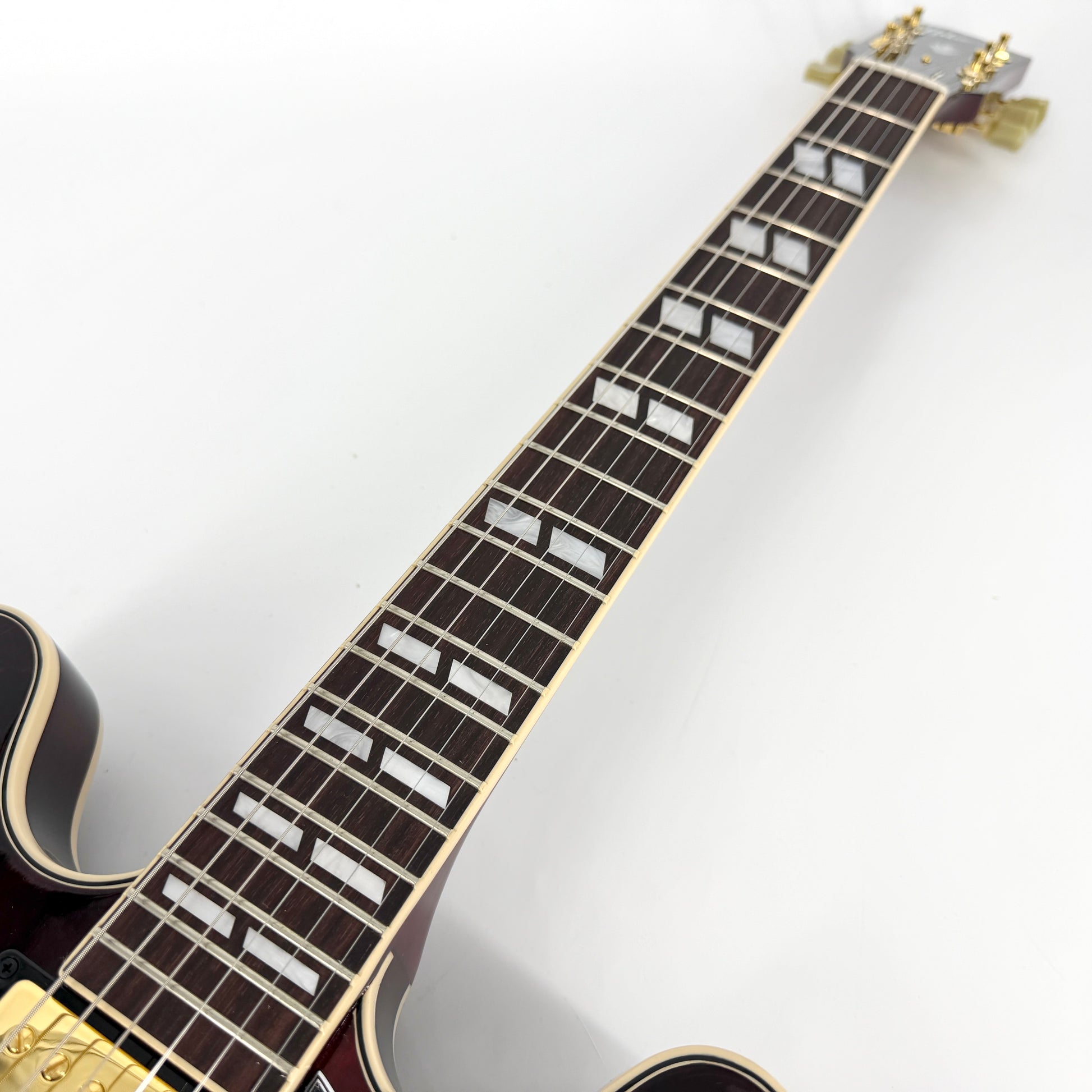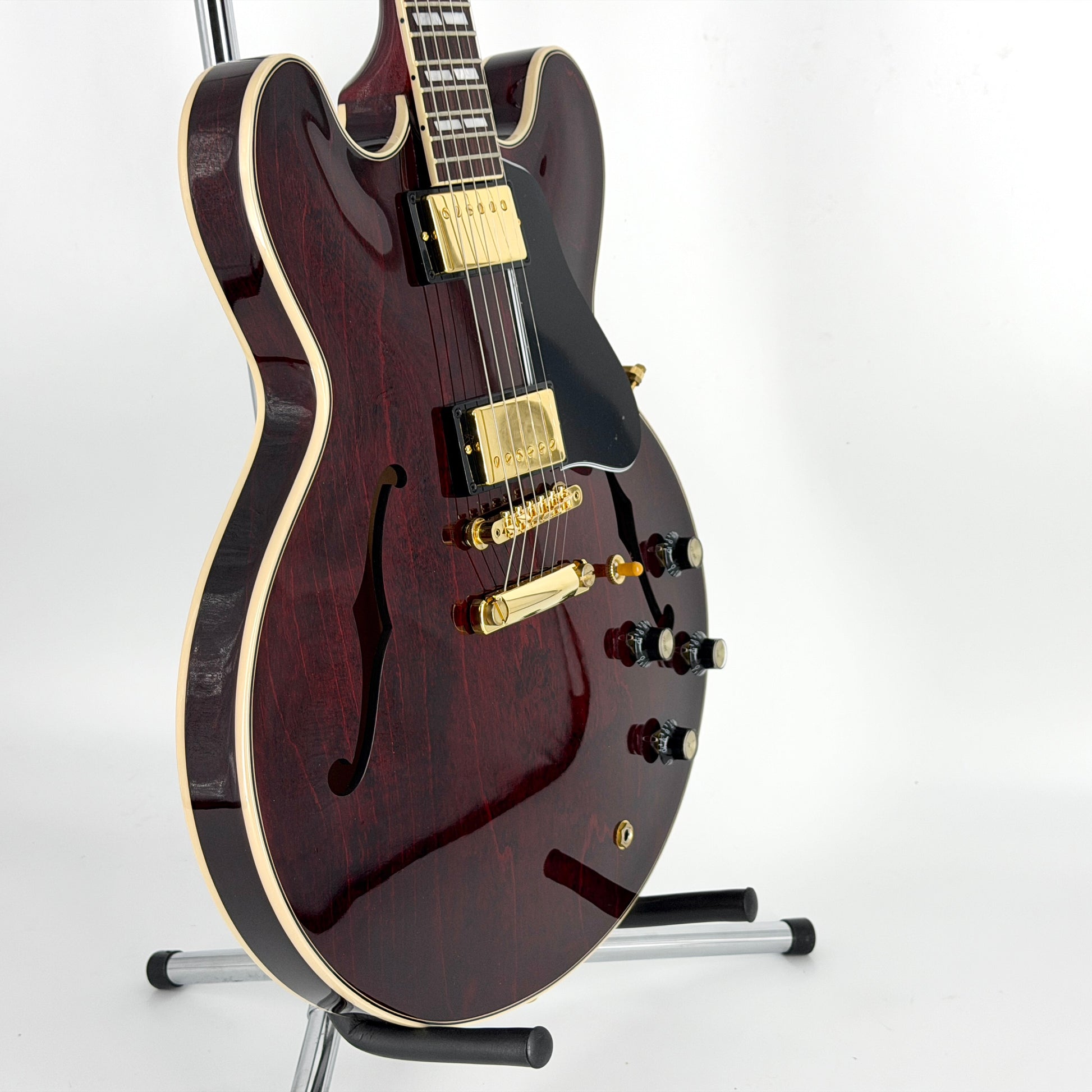 Stunning limited-edition 'Exclusive' ES-345. A Nashville-built premium semi-hollow finished in Wine Red and with a nicely figured body and gold hardware.